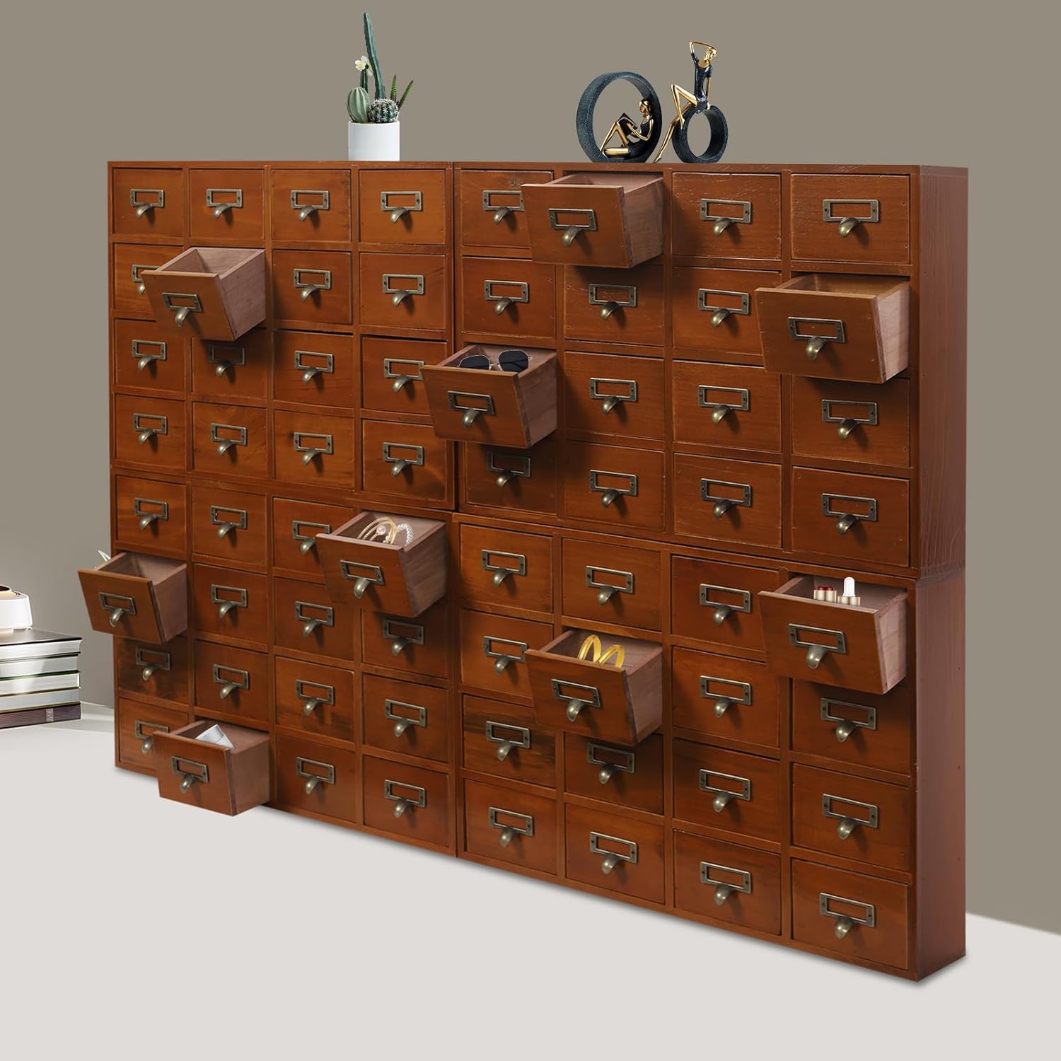 64-Drawer Wood Desk Drawer Organizer, Vintage Tabletop Apothecary Cabinet Wooden Desk Organizer, Card Catalog Cabinet for Dresser, Kitchen, Office Organization and Storage (Brown)