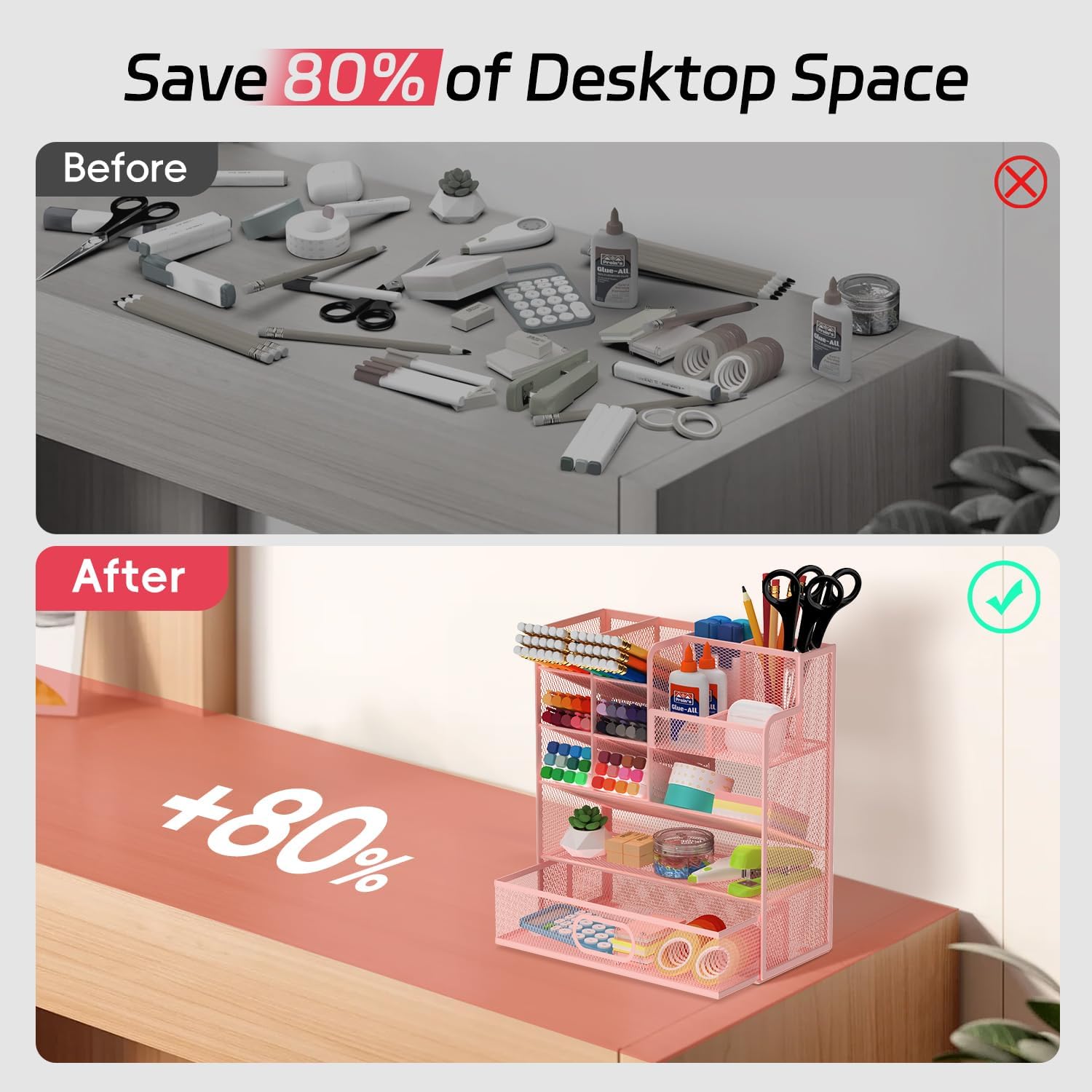Mesh Pen Organizer for Desk, Multi-Functional Pencil Holder with Drawer Desk Organizers, Large Capacity Storage for School Office Home Supplies (Pink)