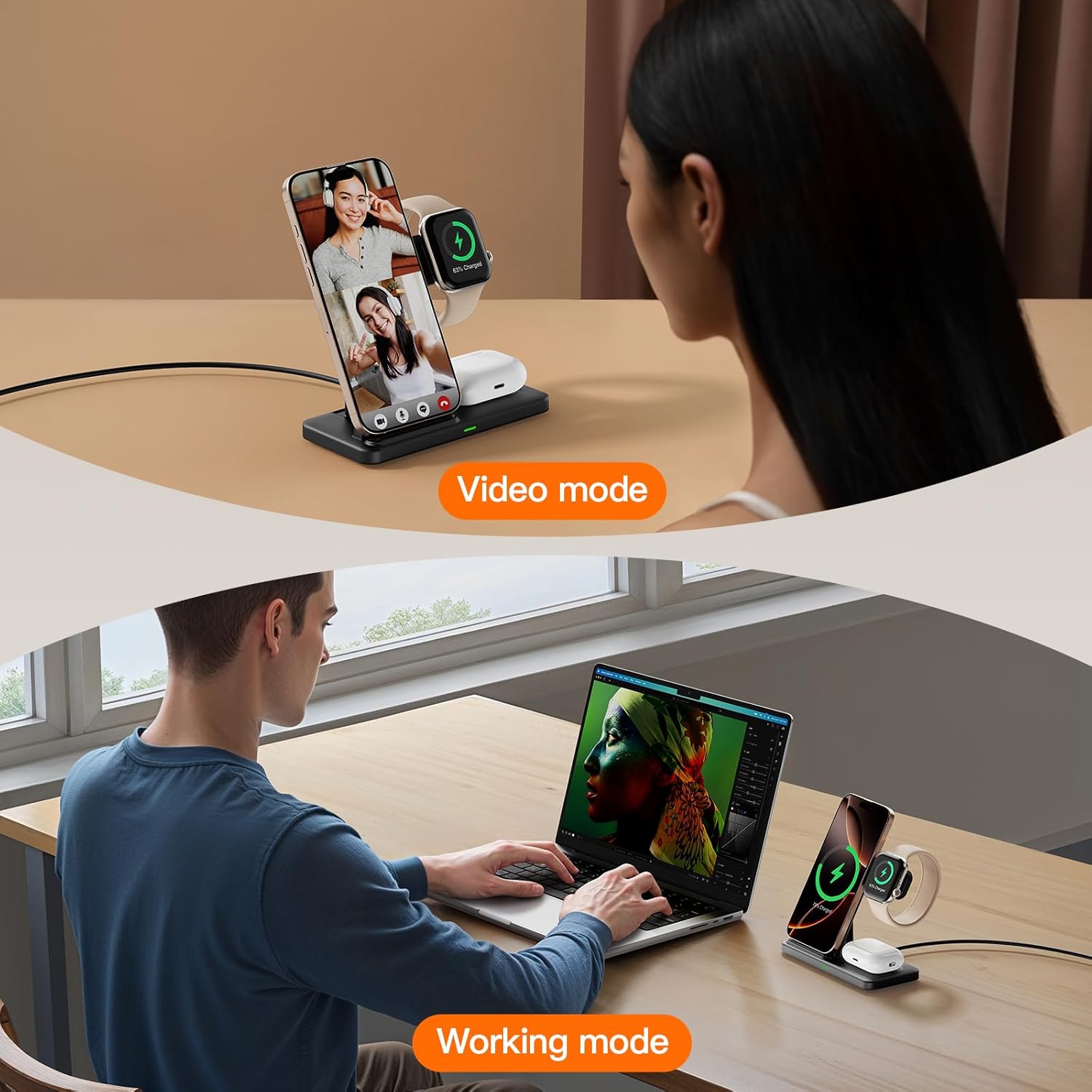 - 【Wide range of compatibility】: Wireless charger phone charging position is no magnetic suction function, but supports wireless-enabled charging devices, it applies to iPhone17/ 16/15/14/13/13/12/11/13/12Mini/Pro/Pro Max/XS/XR/XS MAX/X/8/Plus/And-roid Samsung series (note that only wireless charging devices are supported); Watches and headphones are only supported on i Phone models for iWatch 10/9/8/7/6/5/4/3/2/SE/Ultra/Ultra 2 and Air Pods 2/3/4/Pro/Pro 2 (note: Air Pods are only compatible with wireless charging cases)