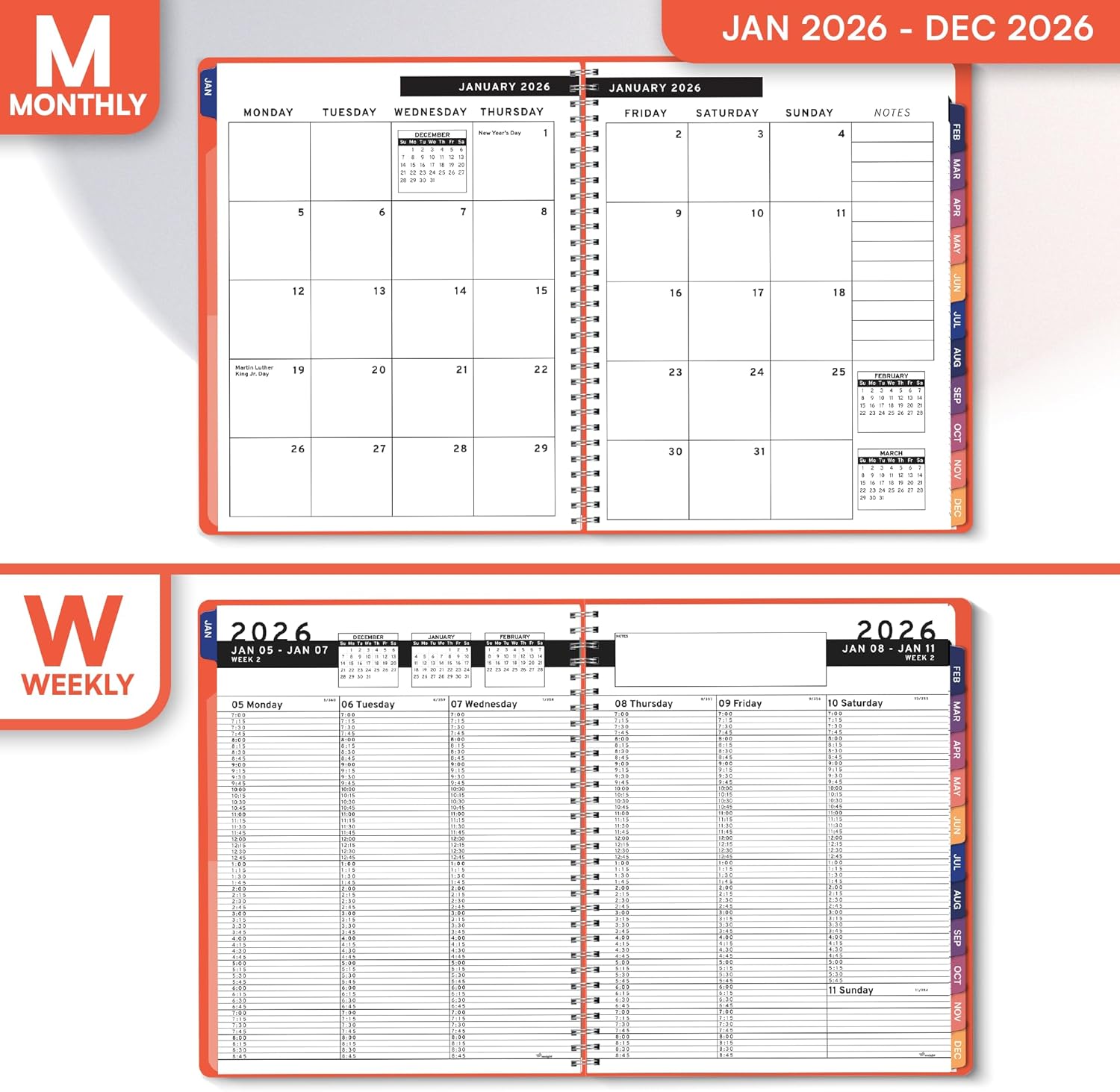 - ๐ฆ๐ข๐๐ง ๐๐ข๐ฉ๐๐ฅ & ๐ง๐ช๐๐ก ๐ช๐๐ฅ๐ ๐๐๐ก๐๐๐ก๐: Starts the Week Monday and Ends Sunday by using our 2026 weekly planner 8.5 x 11. Manufactured with top-quality strong peach PVC cover with extra strong twin-wire binding to prevent any tearing.