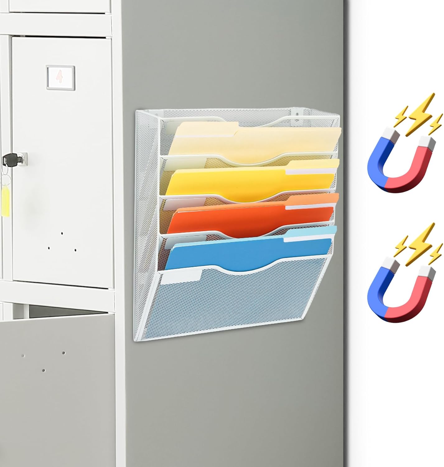 EASEPRES Magnetic 5 Pocket Mesh Hanging File Organizer, Wall Mounted Mail Paper Document Folder Holder, Clipboard Storage Organization Magazine Rack with Nametag Label for Office Home School, White