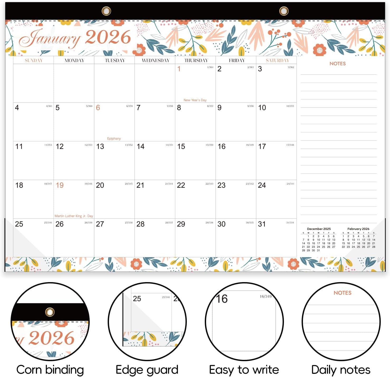 - 【Durable & Multi-Functional】Featuring a waterproof cover + reinforced corners to protect pages, this calendar includes hanging holes for both wall and desk use.