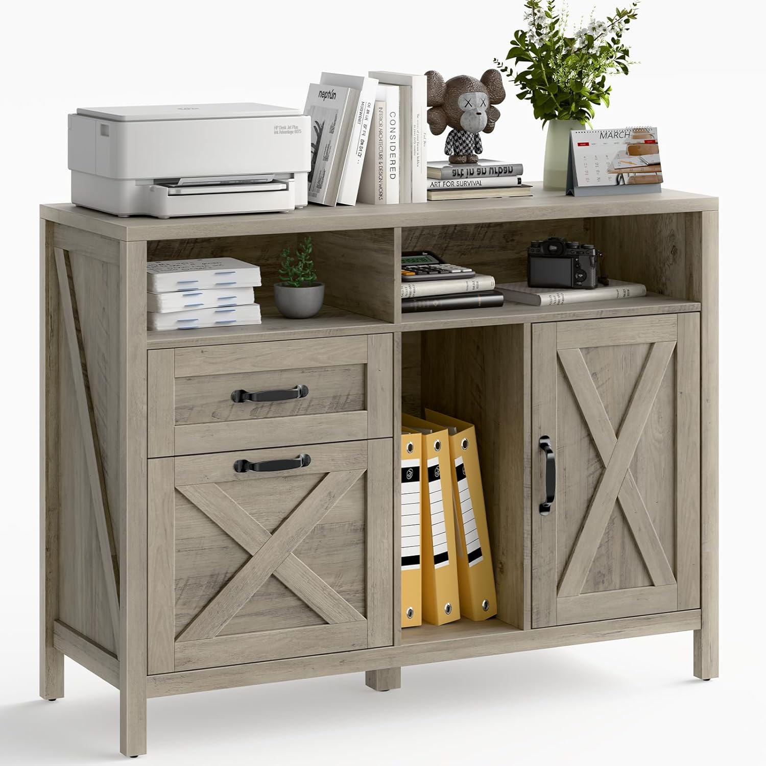 Lateral File Cabinet with 2 Drawers and Door, Farmhouse File Cabinet for A4/Letter Size Hanging Files, Large Wood File Storage Cabinets Printer Stand with Open Space for Home Office Furniture, Grey