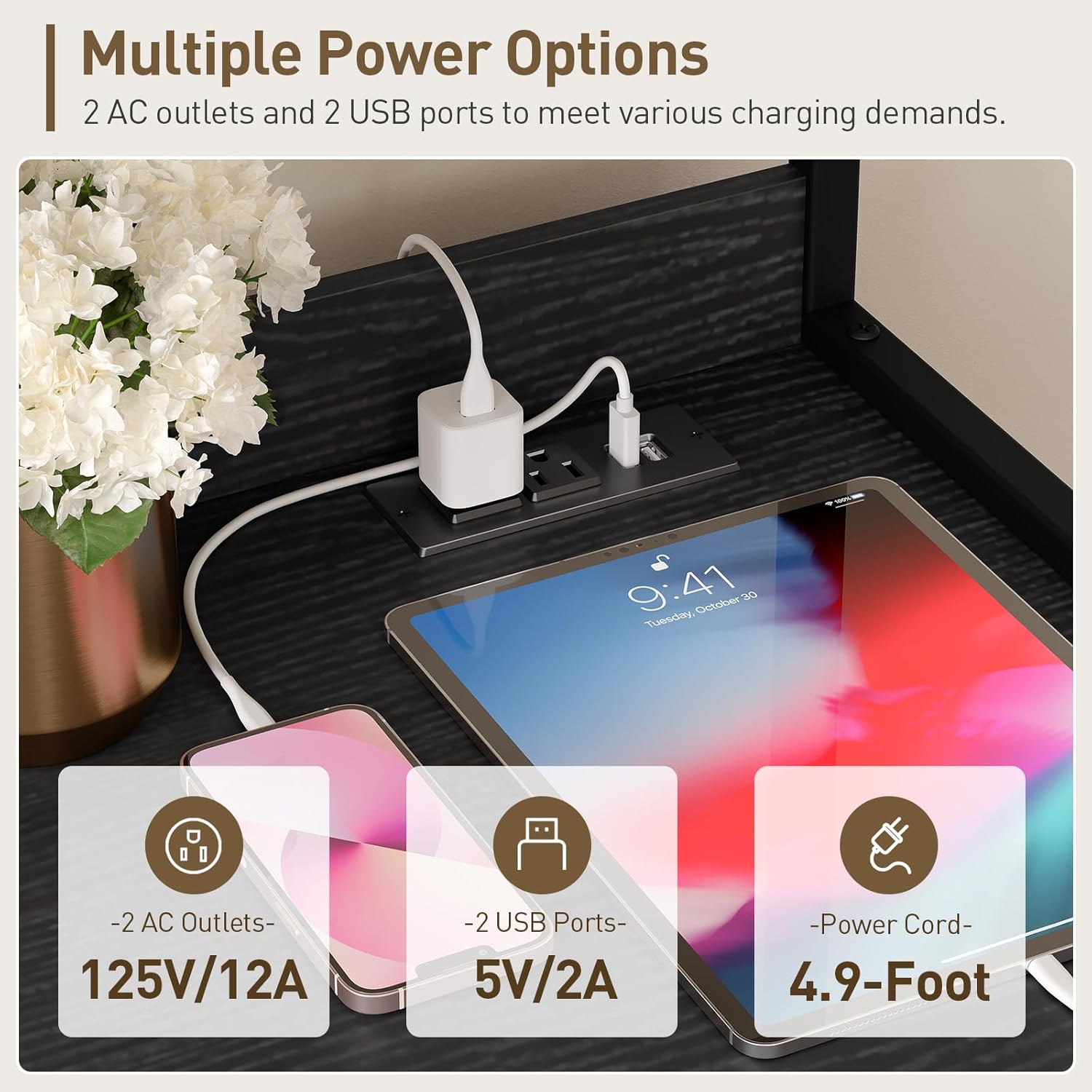 - Charging Convenience: The file cabinet's charging station offers 2 AC and 2 USB ports. It's a convenient place to charge your phone, tablet, or printer. Take a work break to recharge devices and yourself, making work and life blend smoothly