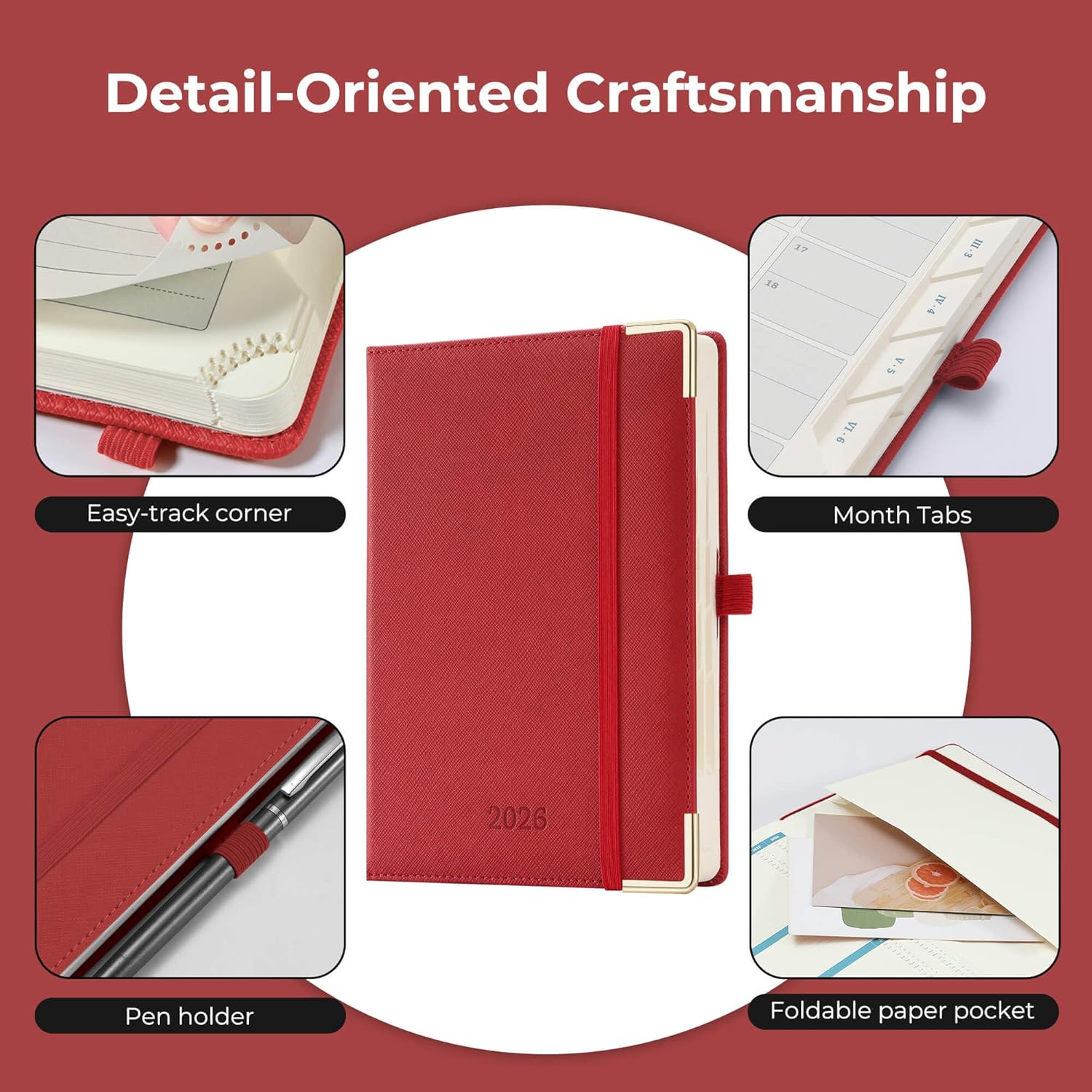 Daily Planner 2026 with One Page Per Day,(A5-8.5" x 5.9"),12 Months Calendar Hourly Appointment Book Monthly Tabs & Self-adhesive Pen Holder,Inner Pocket, Vegan Leather Hardback,Red
