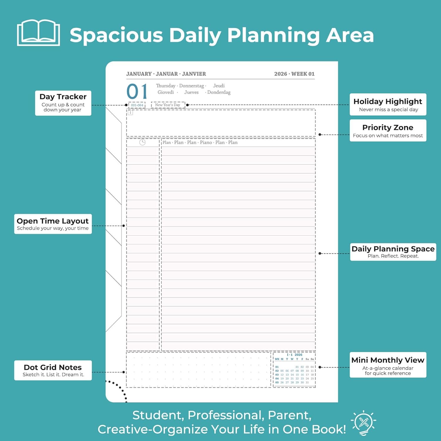 - Professional Grade Material for Your Daily Planner: Crafted with FSC 80GSM thick paper, this day planner 2026 daily and monthly ensures good writing while gentle on your eyes through its ivory white pages. The leather soft cover and lay flat binding make it a calendar planner companion for busy professionals, students, and families