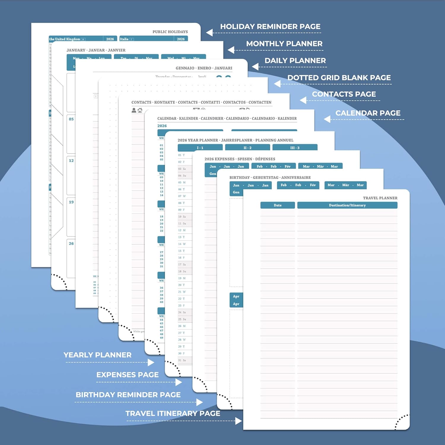 - Multi function Page: Personalized Daily planner system.Monthly pages, holiday reminders, birthday record area for relatives and friends; set up storage contacts, and record inspiration and plans with the dot matrix note area; at the same time, The lined pages allows you to write your annual summary,work planner can travel planning and expense management modules to achieve coordination of schedule and finance