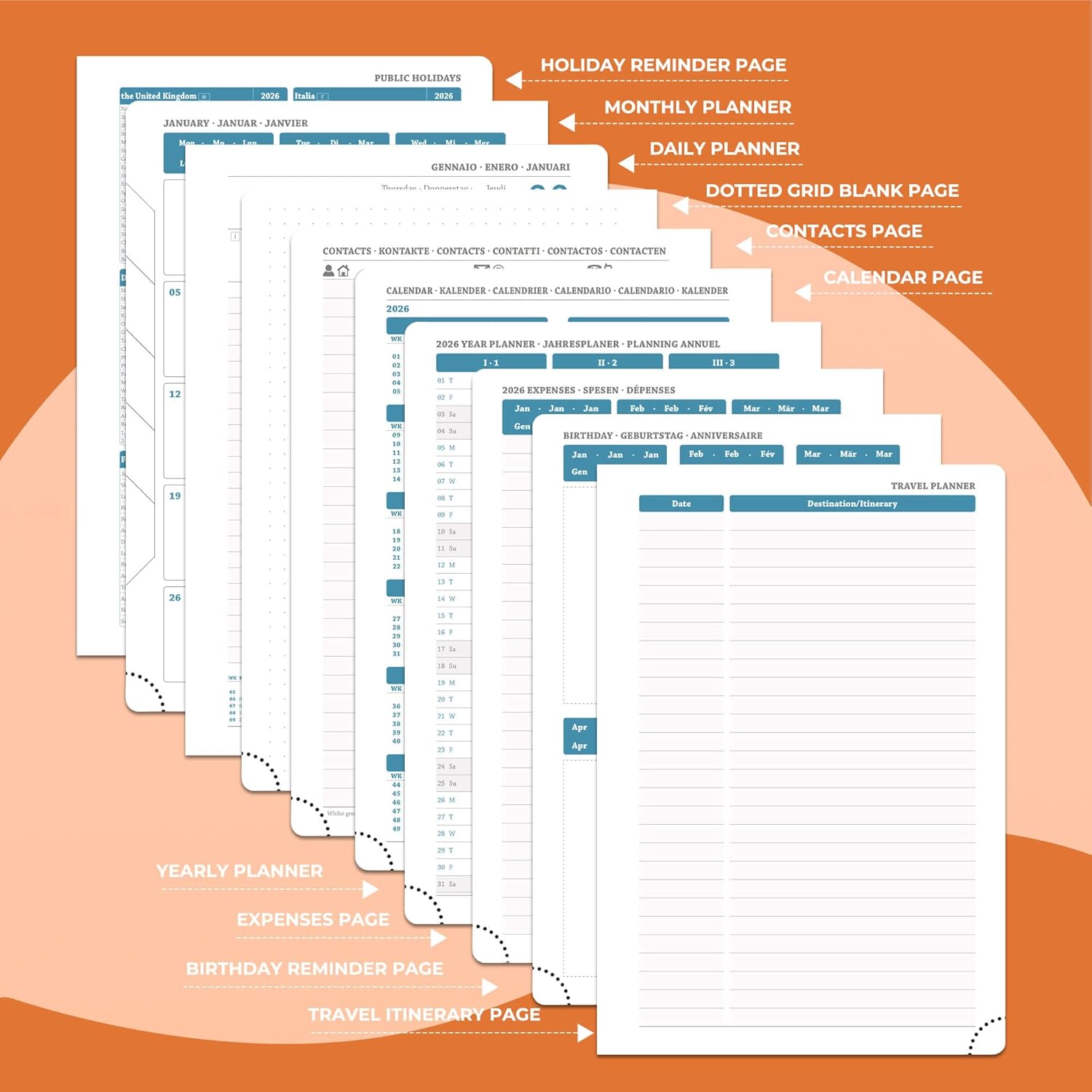 - Multi function Page: Personalized Daily planner system.Monthly pages, holiday reminders, birthday record area for relatives and friends; set up storage contacts, and record inspiration and plans with the dot matrix note area; at the same time, The lined pages allows you to write your annual summary,work planner can travel planning and expense management modules to achieve coordination of schedule and finance