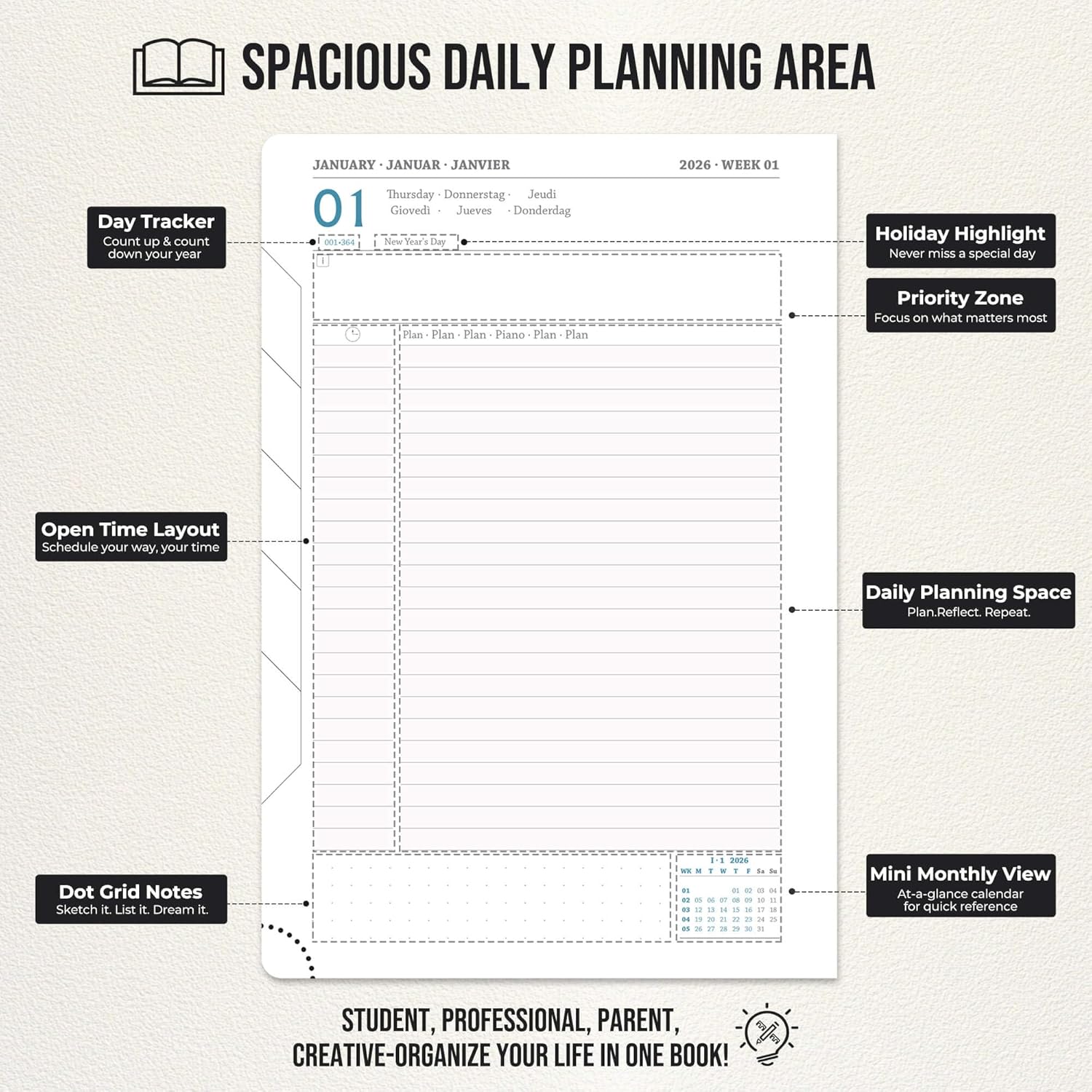 - Professional Grade Material for Your Daily Planner: Crafted with FSC 80GSM thick paper, this day planner 2026 daily and monthly ensures good writing while gentle on your eyes through its ivory white pages. The leather soft cover and lay flat binding make it a calendar planner companion for busy professionals, students, and families