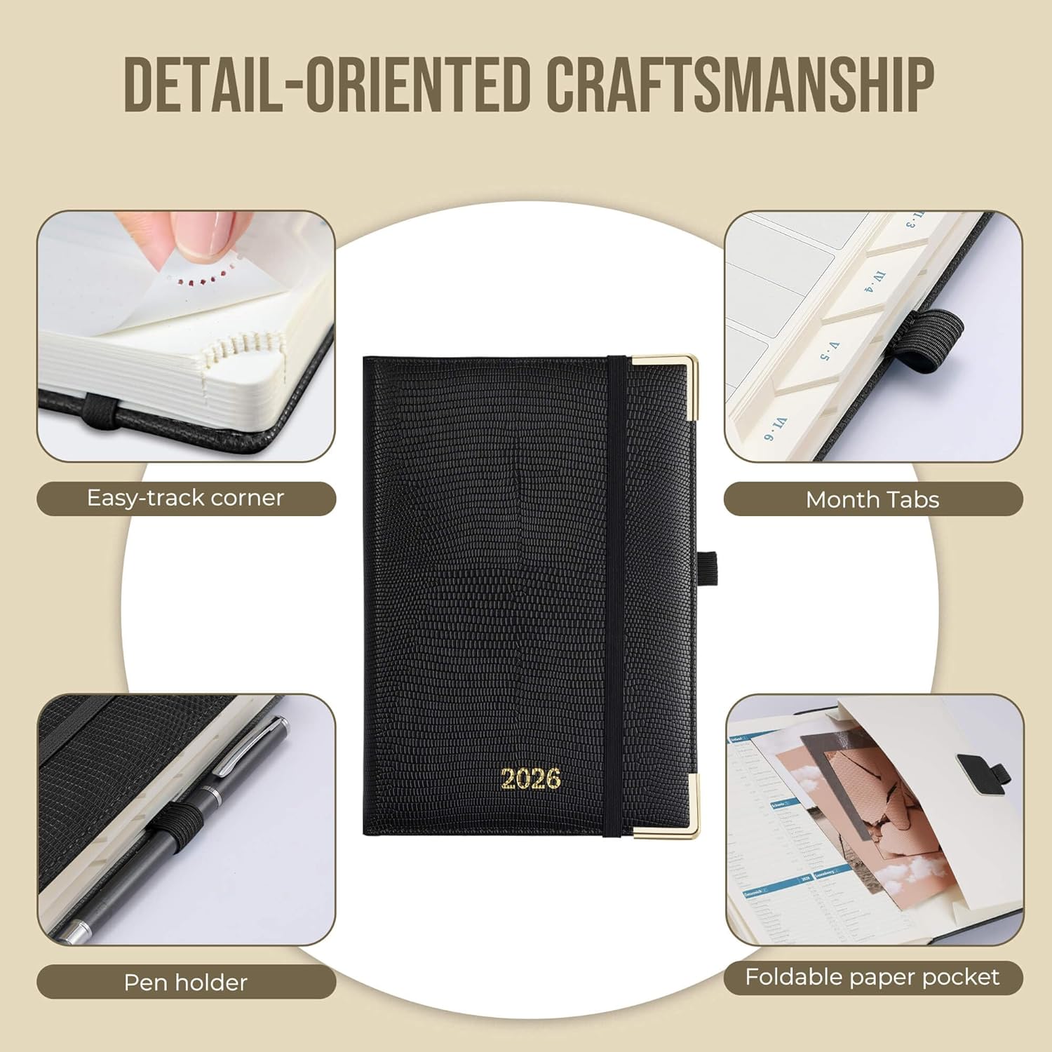 - Thoughtful Design: The monthly tabs on the side of the daily planner can easy locate the current date; The easy-track corner design and ribbon marker make it easy to flip through the small planner. The last page of the 2026 planner daily has an expanded inner pocket that has a small space for storage of cards