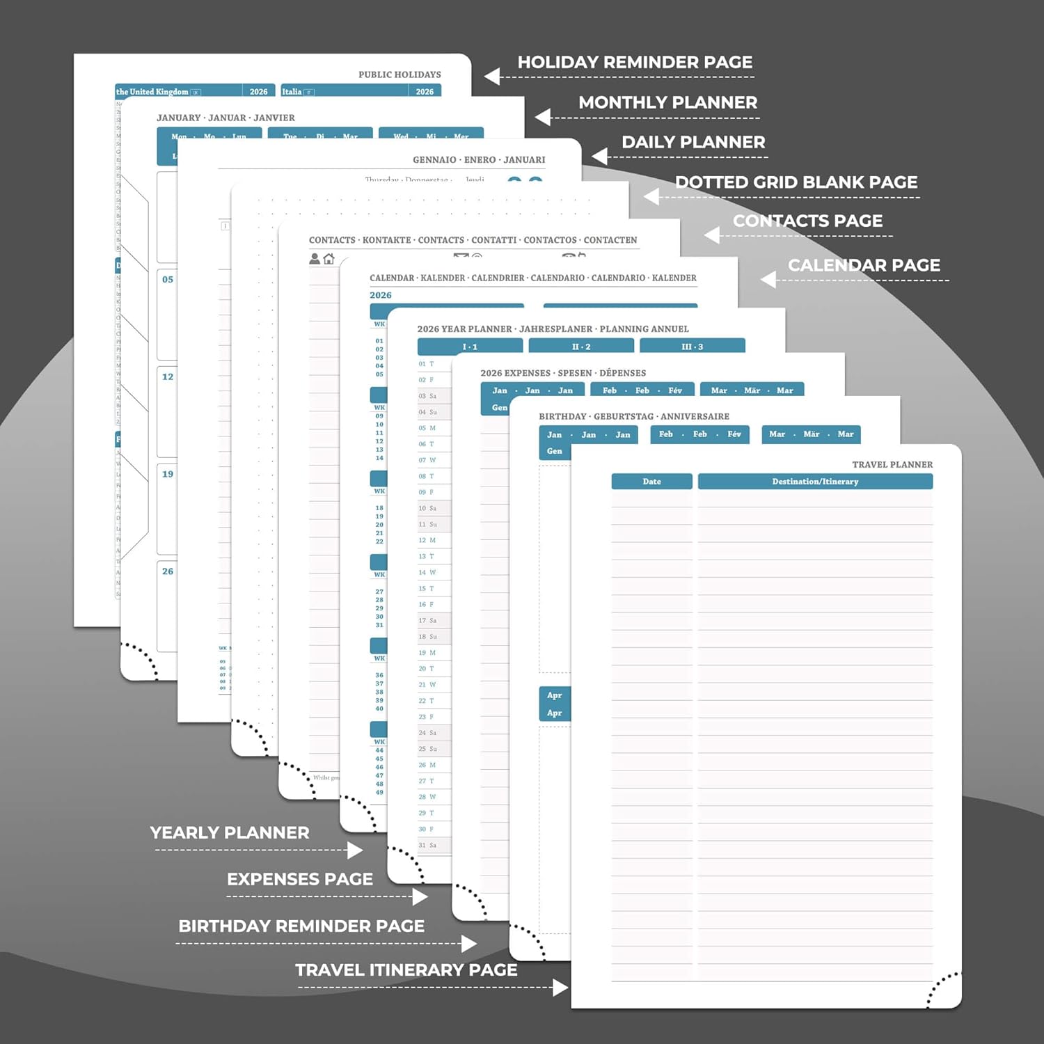 - Multi function Page: Personalized Daily planner system.Monthly pages, holiday reminders, birthday record area for relatives and friends; set up storage contacts, and record inspiration and plans with the dot matrix note area; at the same time, The lined pages allows you to write your annual summary,work planner can travel planning and expense management modules to achieve coordination of schedule and finance