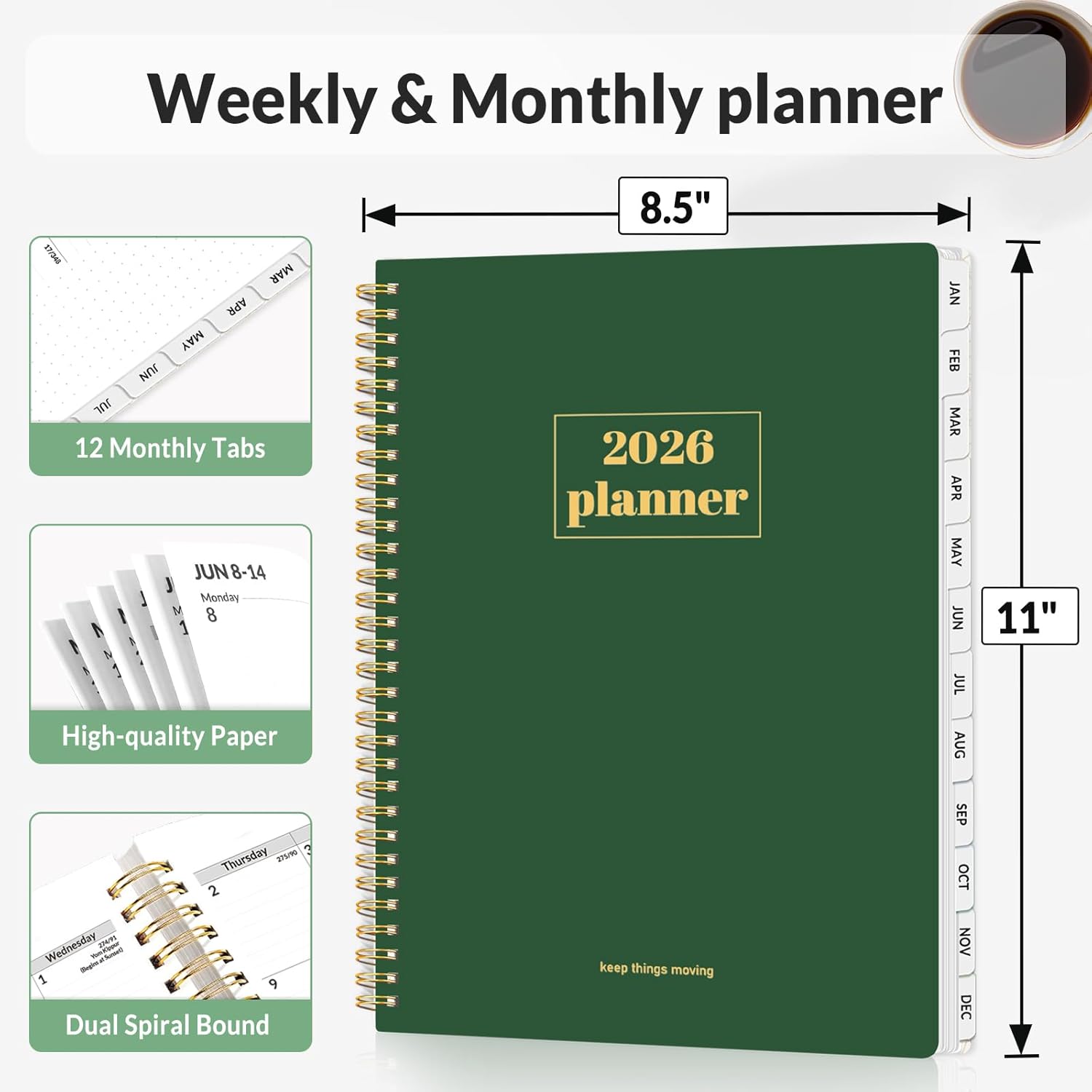 SUNEE Planner 2026 Weekly and Monthly, January 2026-December 2026, 8.5"x11", Tabs, Note Pages,Spiral Binding, Deep Green