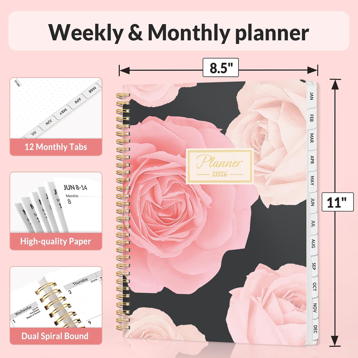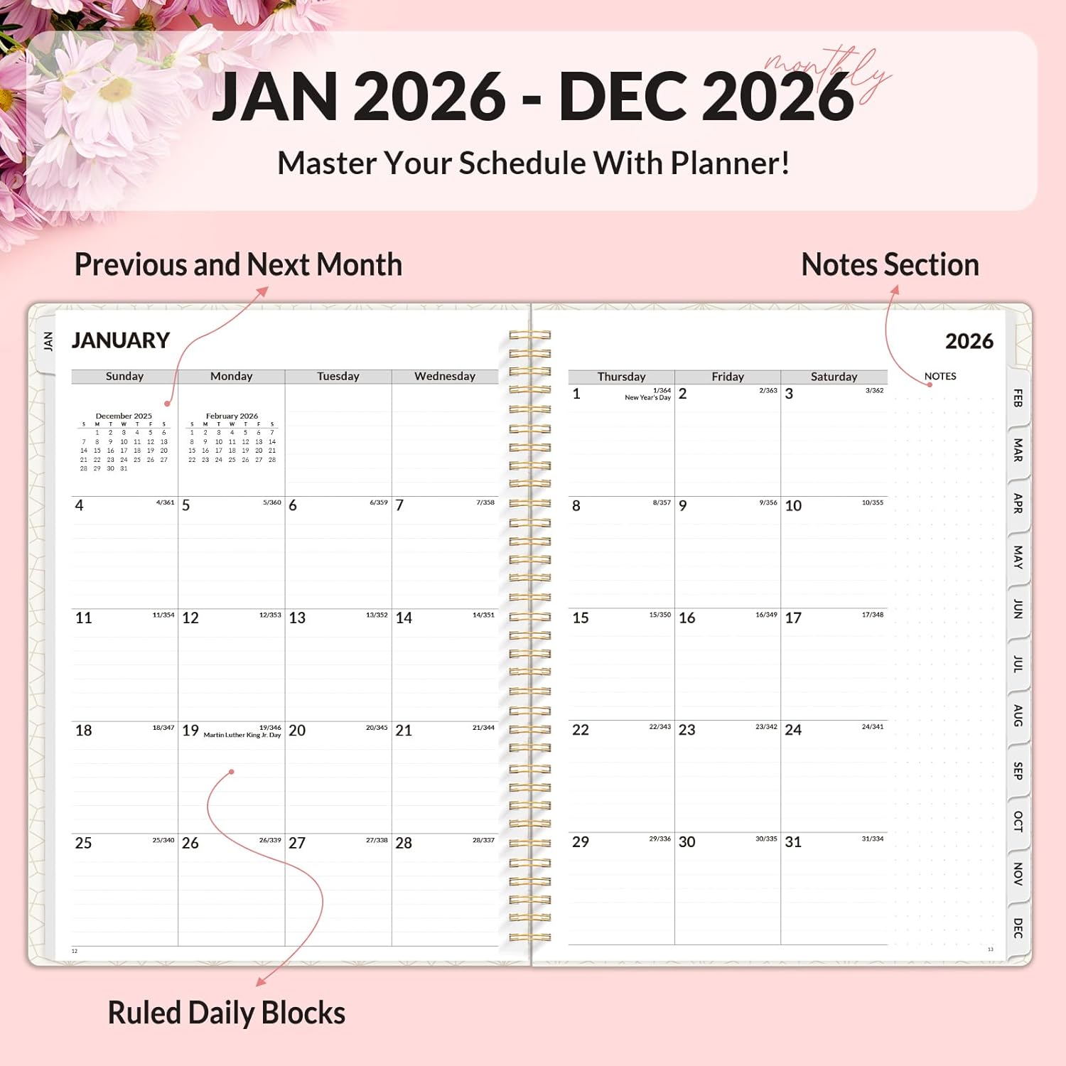 - Plan Confidently β Cover from January 2026 to December 2026, Features 12 months of monthly and weekly pages, and also inclueds 3 extra monthly pages for October to December 2025 and 12-monthly tabs, with Lay-flat capability for all your planning and scheduling needs, and measures 8.5" x 11"