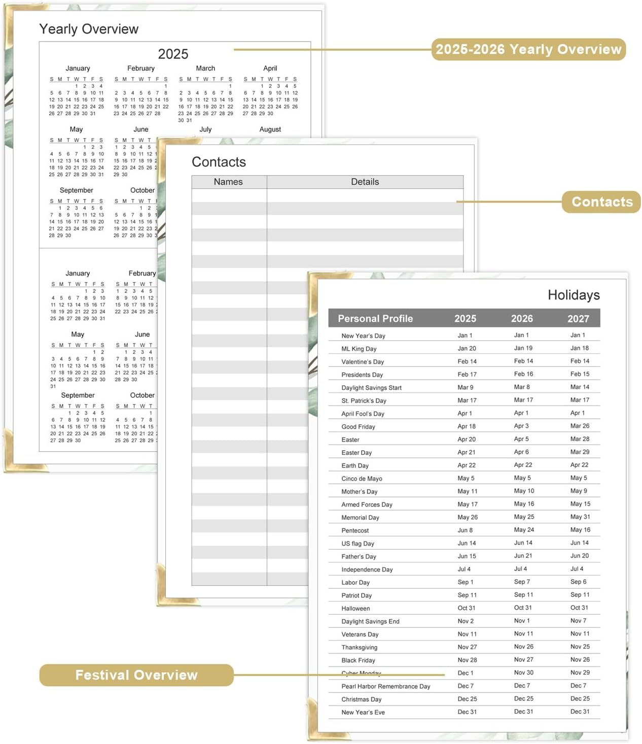 - 224 SHEETS / 448 PAGES - This undated planner measures 5.8 x 8.5 inches, a comfortable size for daily use and carrying. The planner notebook includes a Yearly Overview, Personal Information, Contacts, Important Dates, Monthly Pages, Daily Pages, Notes Pages, and a festival overview page covering 2025-2027. It comprehensively contains everything needed for daily use.