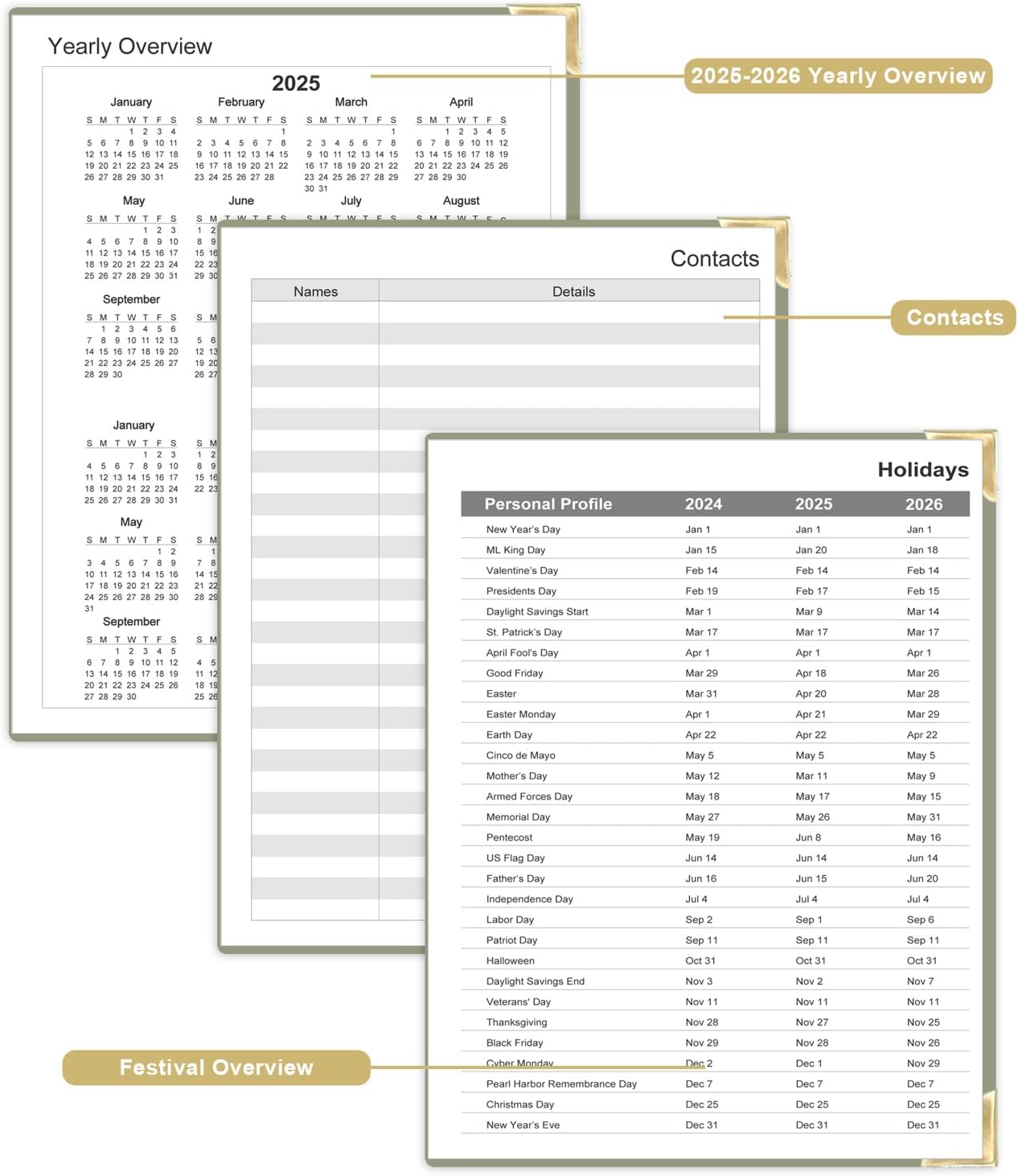 - 224 SHEETS / 448 PAGES - This undated planner measures 8.5 x 11 inches, a comfortable size for daily use and carrying. The planner notebook includes a Yearly Overview, Personal Information, Contacts, Important Dates, Monthly Pages, Daily Pages, Notes Pages, and a festival overview page covering 2025-2027. It comprehensively contains everything needed for daily use.