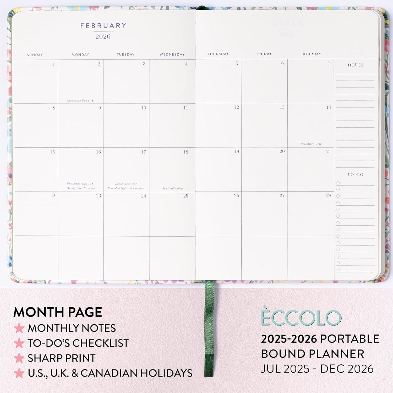 2025-2026 Eccolo 18 Month Bound Planner, Monthly & Weekly Pages (5.25 x 7.75" - July 2025 - Dec 2026 - Flower Garden)