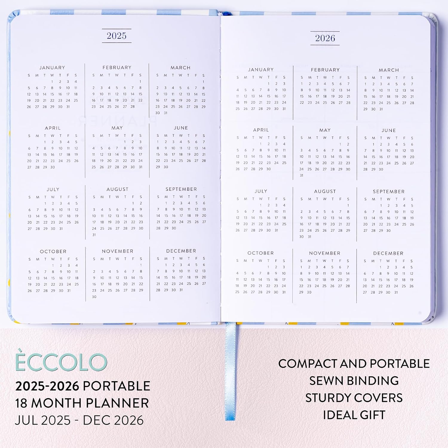 2025-2026 Eccolo 18 Month Bound Planner, Monthly & Weekly Pages (5.25 x 7.75" - July 2025 - Dec 2026 - Lemon Blue Stripes)
