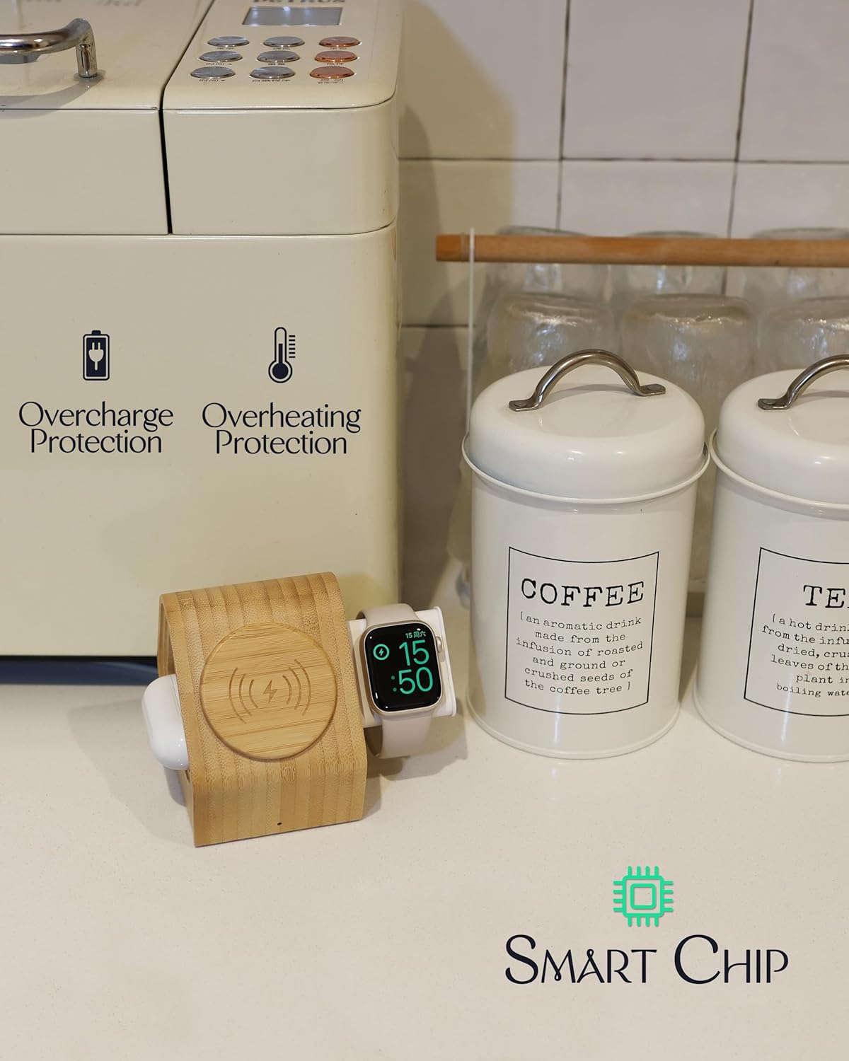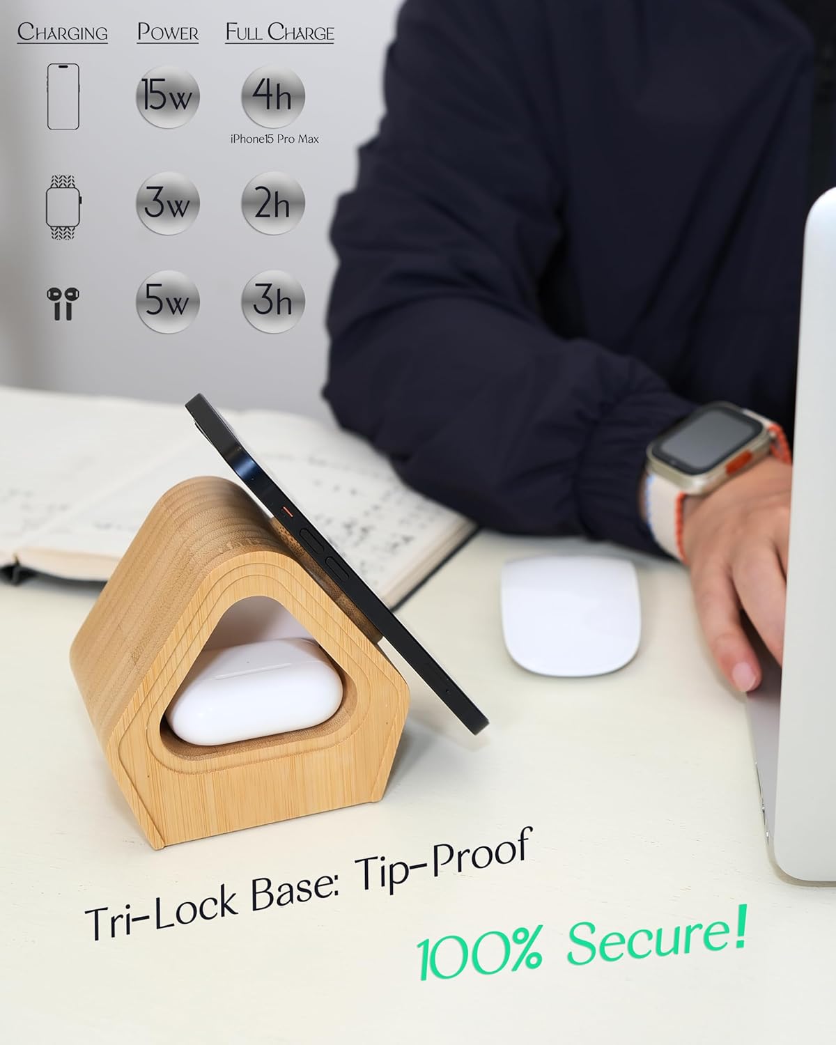 - Space-Saving Design: Compact and cool; our bamboo wireless charging station fits anywhere; MagSafe for iPhone 16-11 Series; a slot for AirPods 4-2, Pro; and a retractable charging stand for iWatch 10-2, Ultra—efficient and good-looking