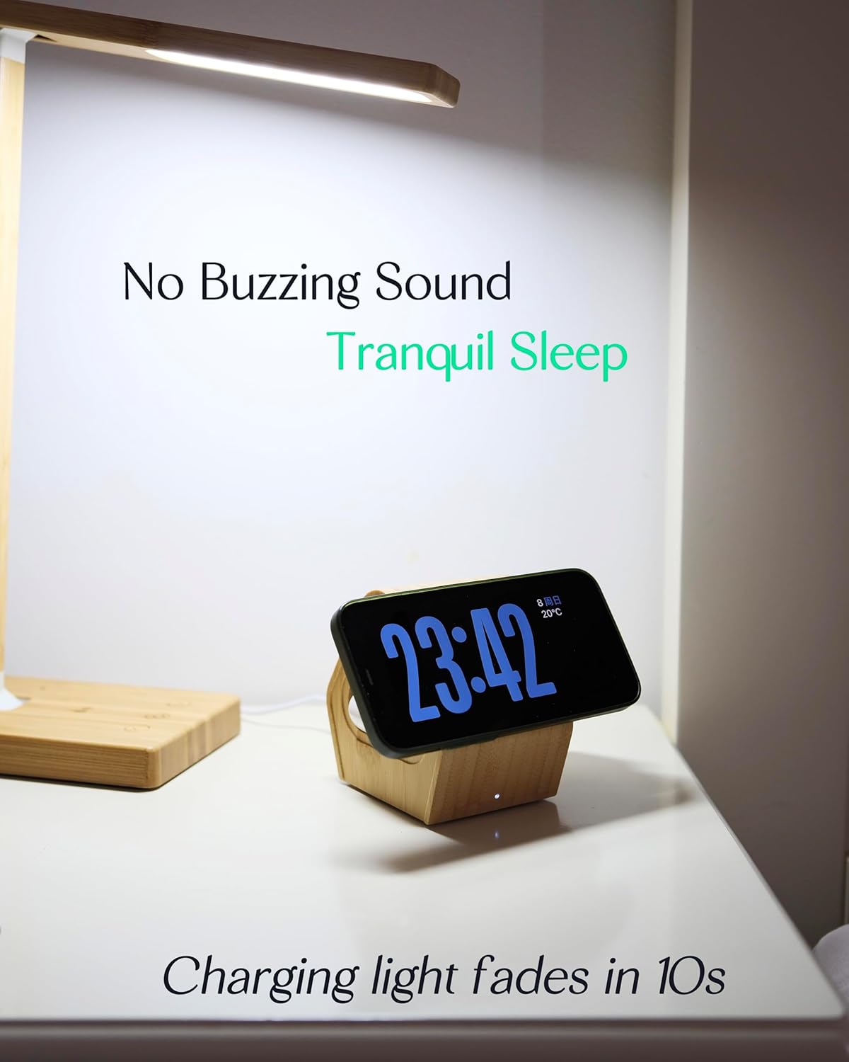 - Smart Charger, Safe Charging: Our smart chip keeps your phone safe from overcharging and overheating; the bamboo charging station operates without buzzing sounds; and the charging light will gently fade out after 10s, ensuring a tranquil sleep environment