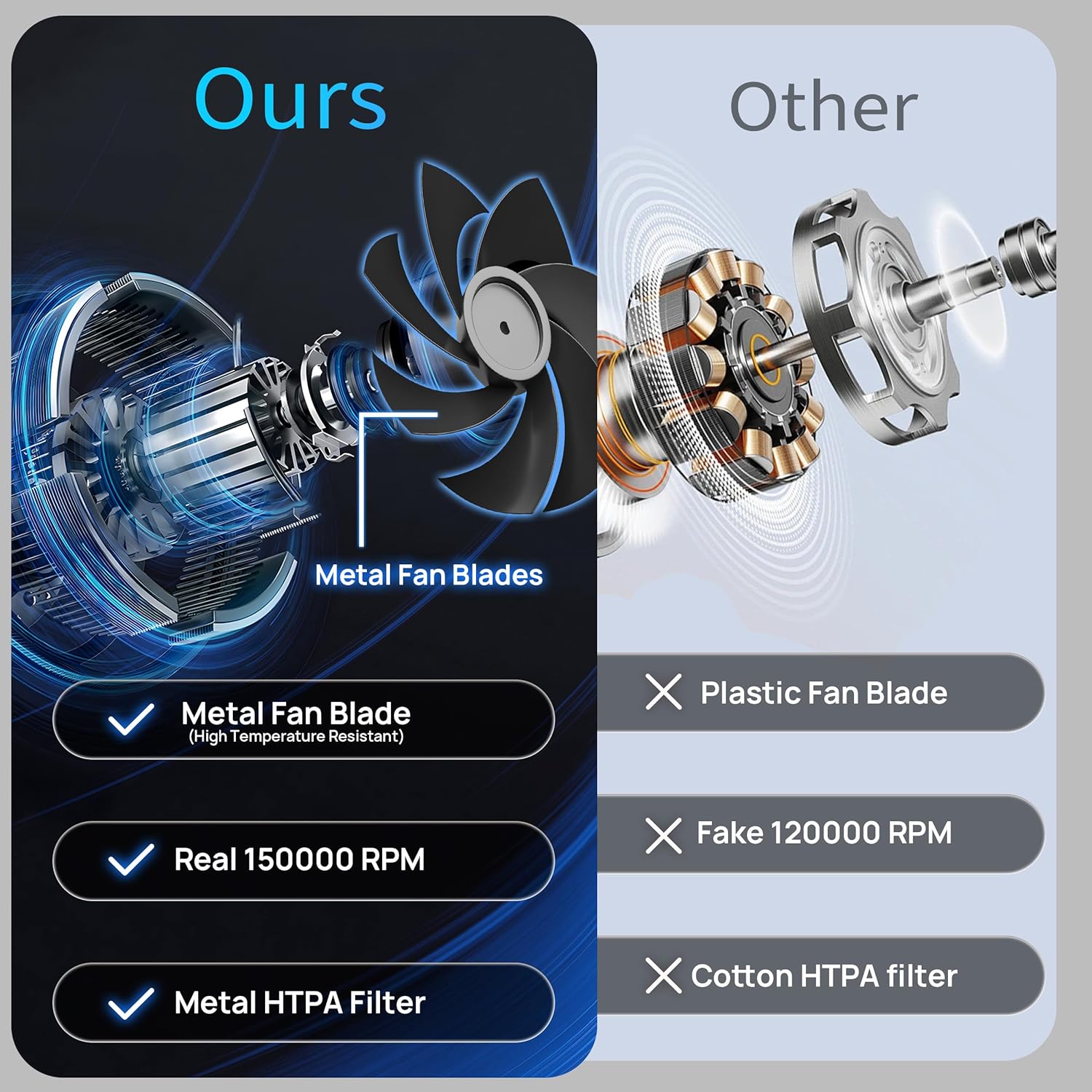 - The handheld vacuum cordless has a brushless motor with two powerful gears that produce a suction of up to 16000kpa. It operates at speeds ranging from 100,000 to 150,000 RPM, effectively removing dust from any corner or space