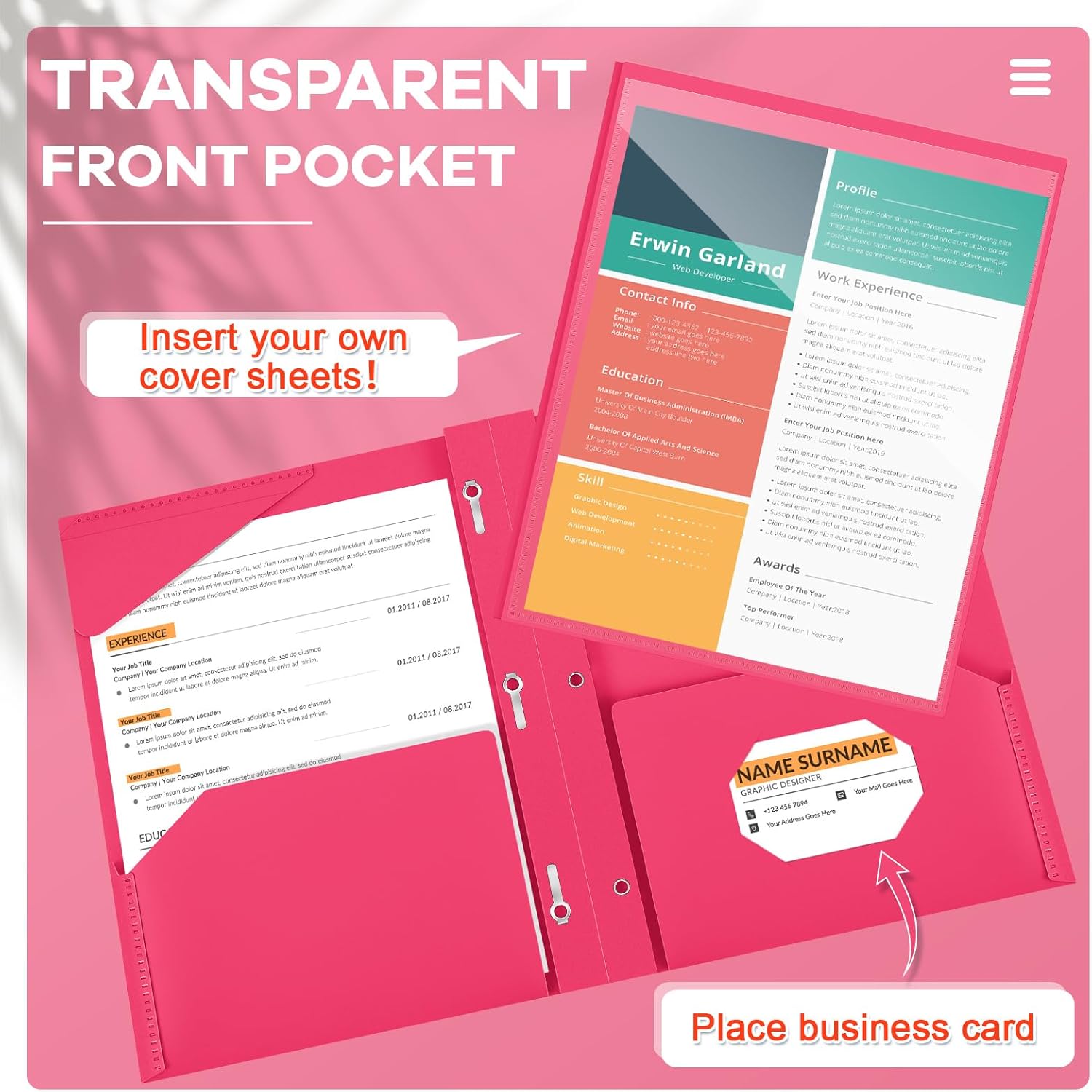 - Practical and Useful: with a clear front pocket, you can put your catalog, tables, favorite reports, presentations and more for clear display; Each plastic folder has 2 internal pockets to help organize and store your letter sized paper and documents, there are also 3 prongs to secure your 3-hole loose leaf paper, and the card slot can hold your ID card or business card, practical for your daily work