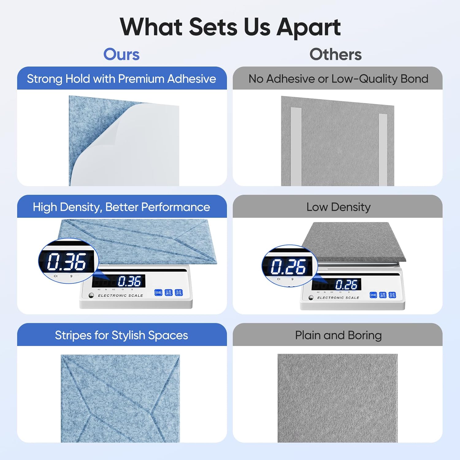- Effortless Installation -- Each acoustic panel comes with a strong self-adhesive backing—just peel and stick. No tools, nails, or extra adhesives needed.