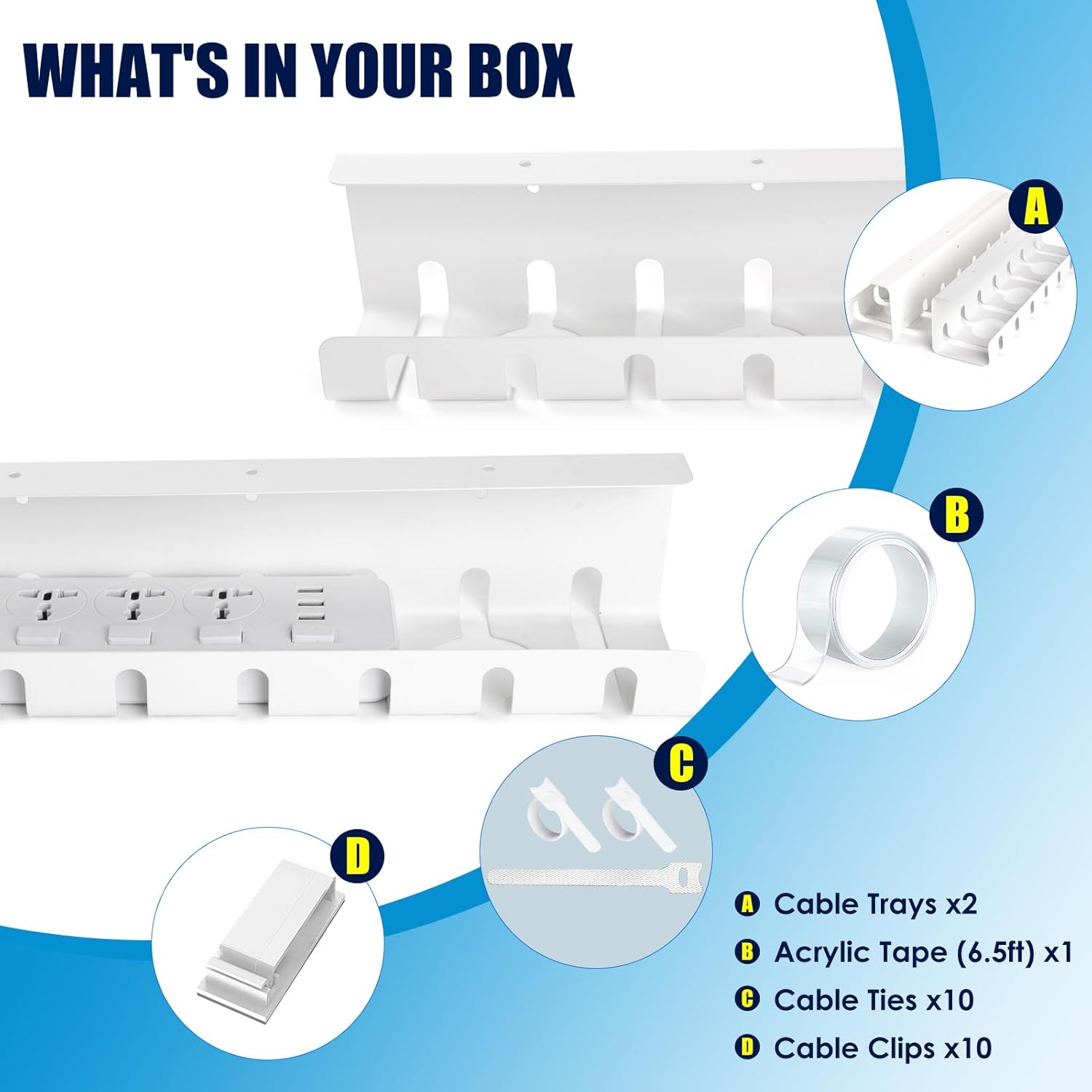- Complete accessories: The package includes everything you need to install the cable tray and organize your cables, 2 cable trays, a roll of 6.5-foot acrylic tape, 10 cable clips and 10 cable ties. These accessories can help you tidy up your workspace and avoid cable clutter.