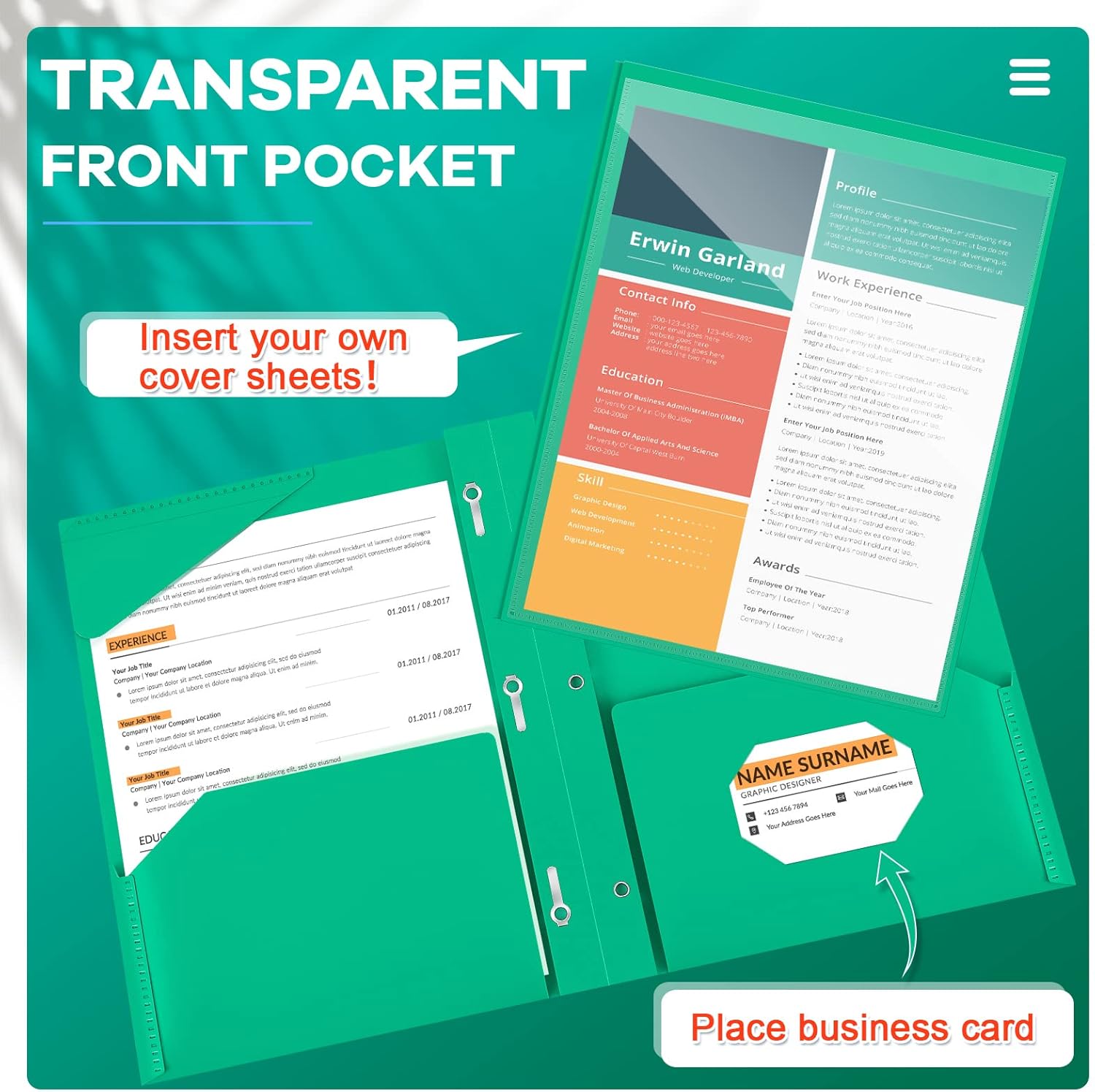 - Practical and Useful: with a clear front pocket, you can put your catalog, tables, favorite reports, presentations and more for clear display; Each plastic folder has 2 internal pockets to help organize and store your letter sized paper and documents, there are also 3 prongs to secure your 3-hole loose leaf paper, and the card slot can hold your ID card or business card, practical for your daily work