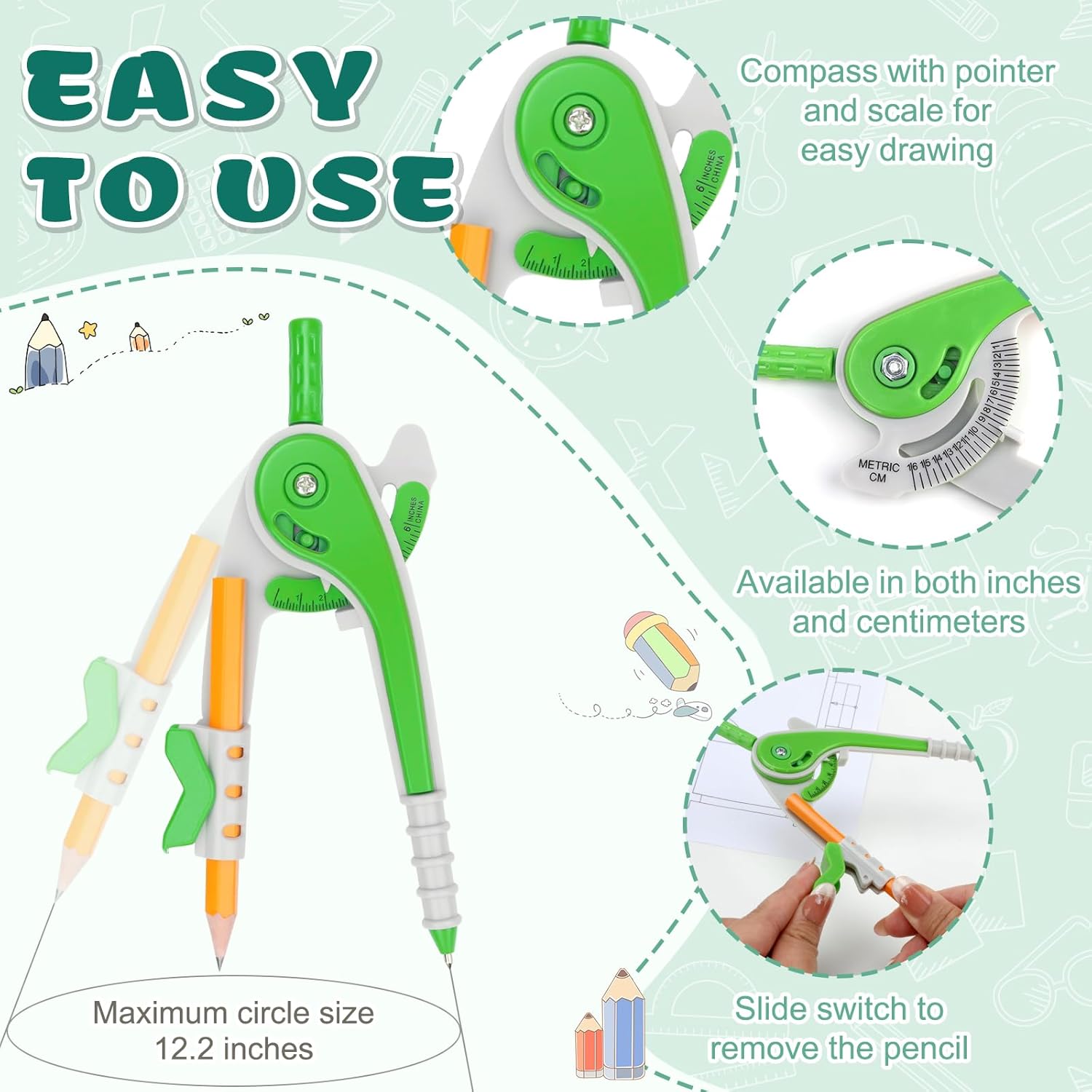 - Dual Scale Design: Featuring both inch and centimeter scales for precise and convenient measurement. Suitable for extended use, the math compass's hardened point allows accurate marking and stable operation. (Note: The math compass tip is sharp and hard; please handle with care to avoid injury.) An essential geometry tool for any math project