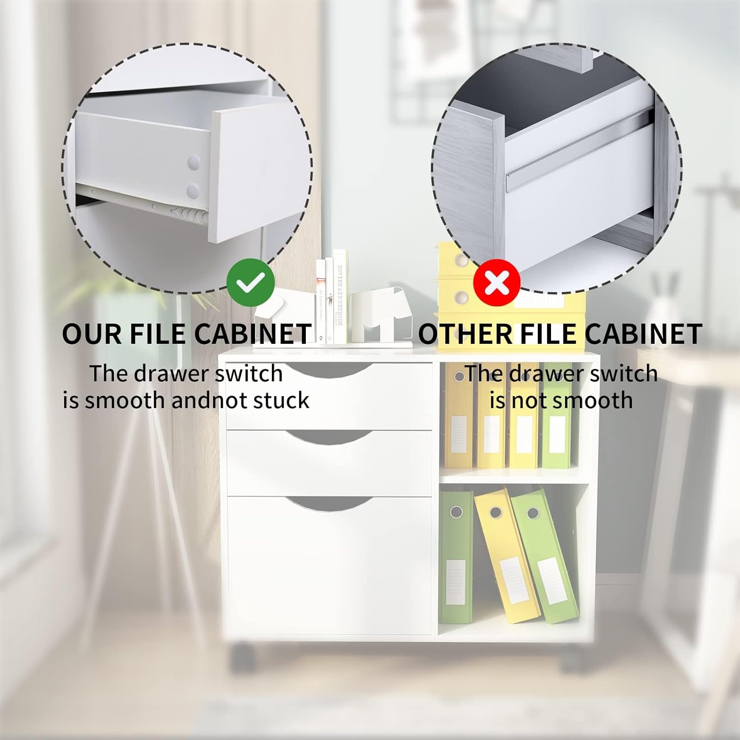 - EASY TO MOVE: The filing cabinet is equipped with four rollers, which can be rotated 360°, and the rollers have fixed brakes to prevent the file cabinet from sliding