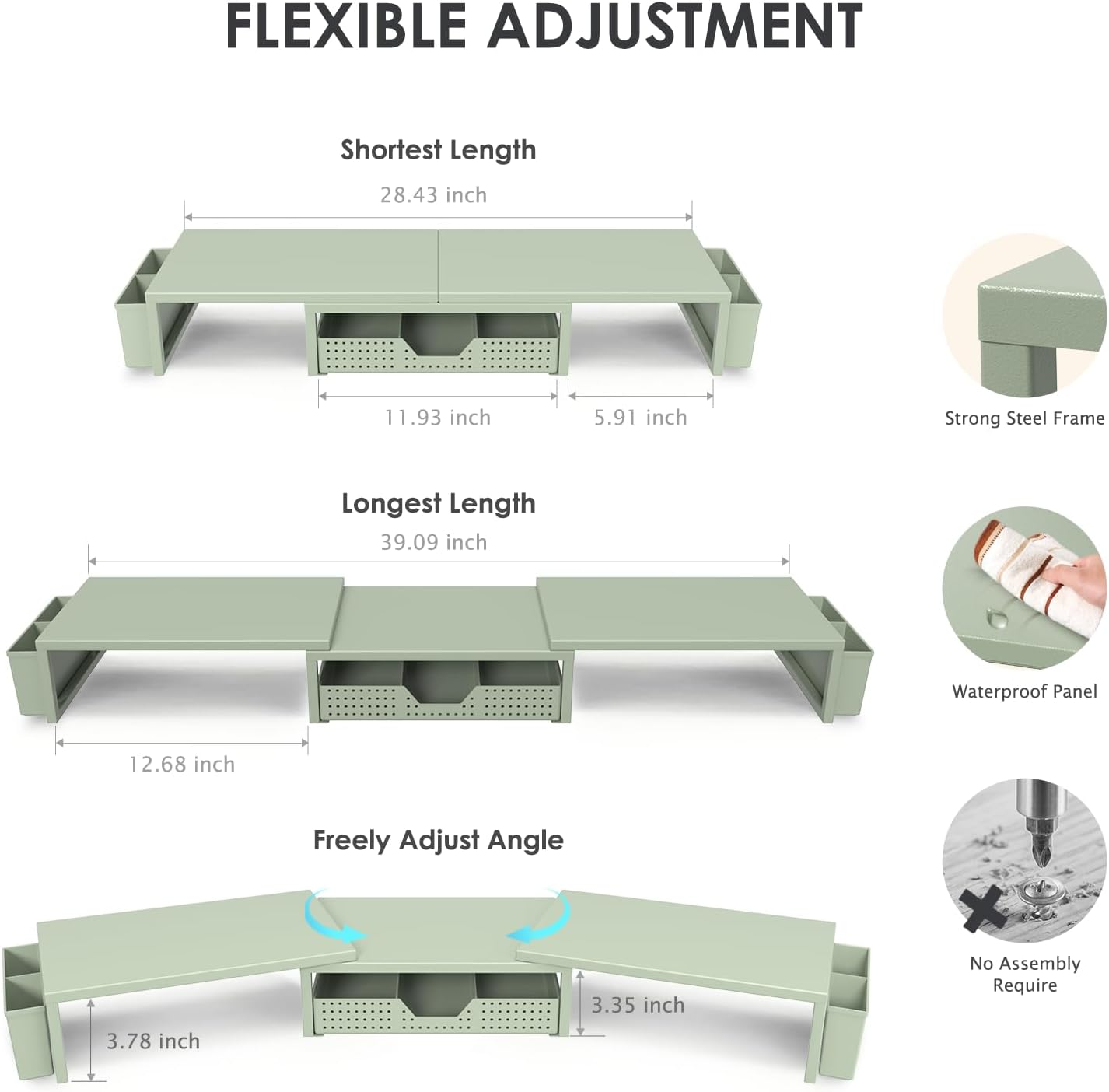 Desk Organizers and Accessories, Dual Monitor Stand Riser with Drawer and 2 Pen Holders, Desk Shelf Metal Computer Monitor Stand for Office Workspace Organizers, Desktop Organization (Green)