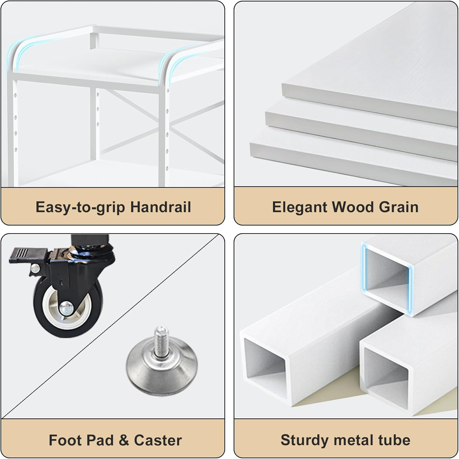 - Durable Construction: This printer table features two metal tubes under each board, serving as load-bearing crossbars, and is reinforced with an X-shaped steel sheet to create a more stable frame. The metal tubes are powder-coated to prevent rust and resist wear. The wooden boards, crafted from particleboard, boast a clear wood grain, combining aesthetic appeal with practicality.