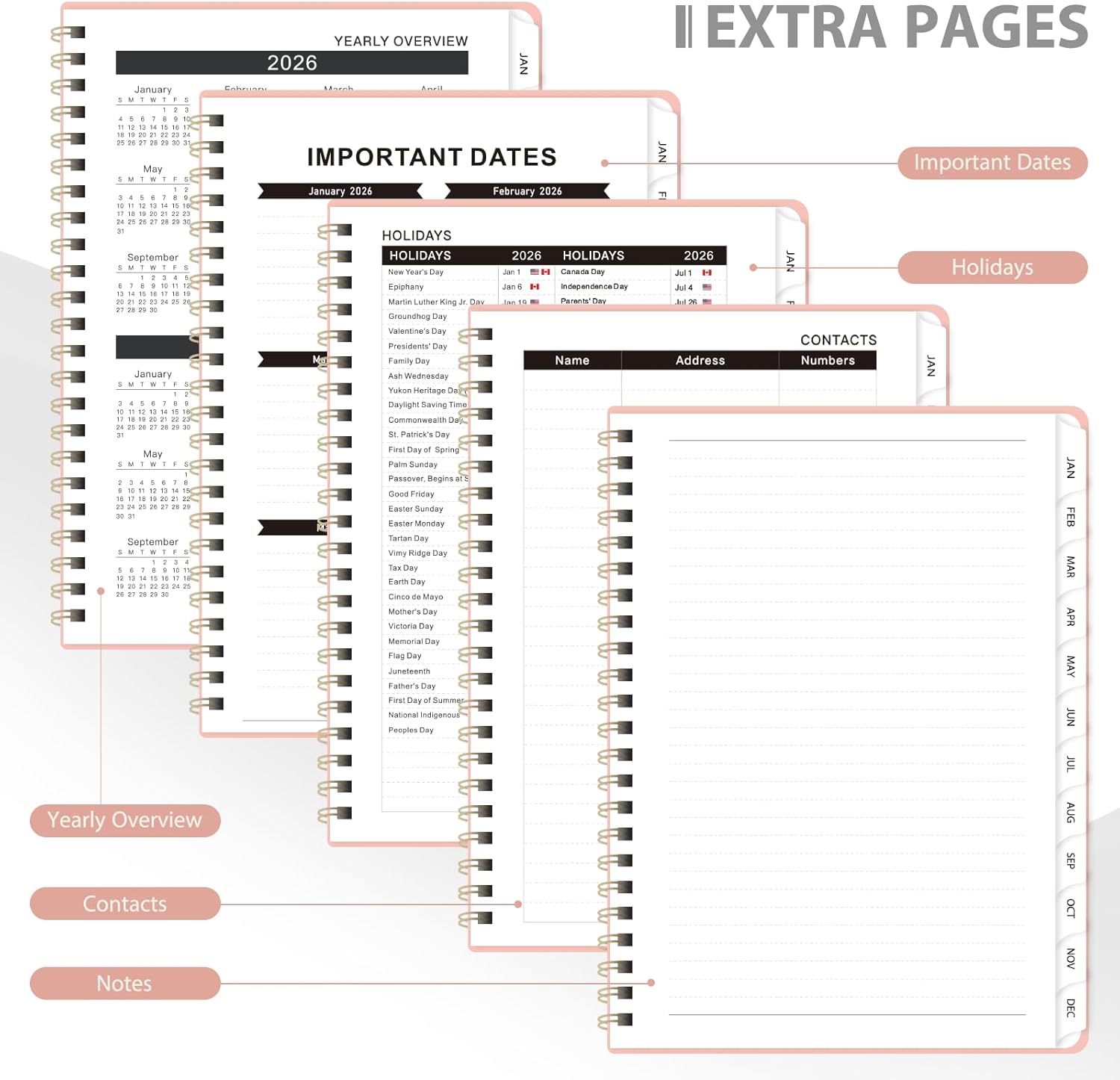 - [THOUGHTFUL DESIGN] – The agenda 2026 comes with an elastic band to keep it securely closed, monthly tabs for quick navigation, and a clear double-sided pocket for extra storage. Each monthly calendar page includes a motivational quote to inspire and keep you focused.