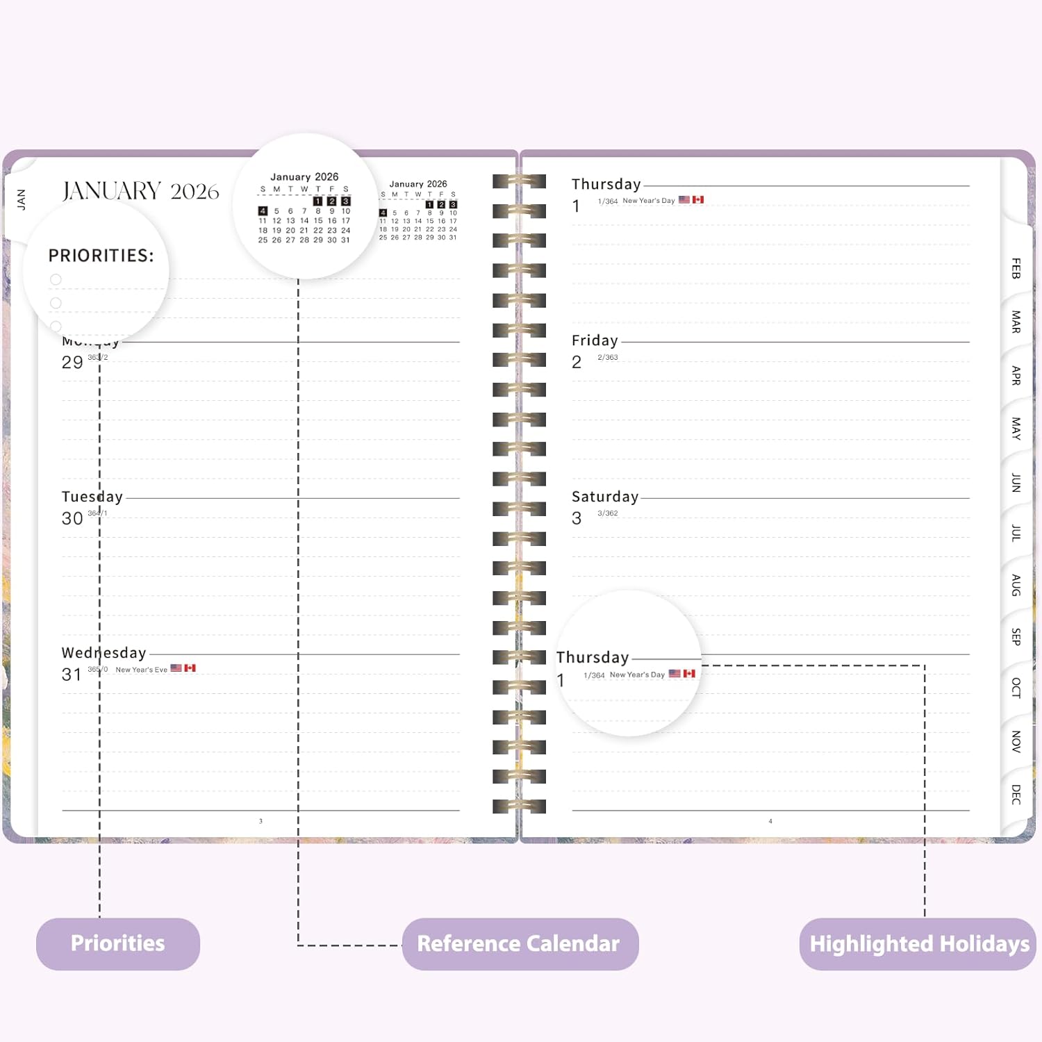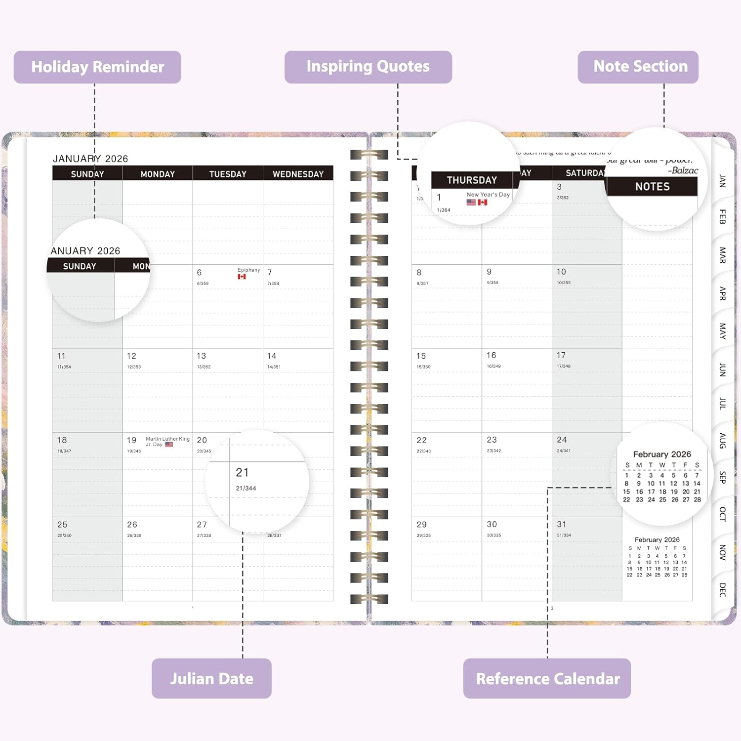 - [THOUGHTFUL DESIGN] – Boasting a secure elastic band, easy-to-use monthly tabs, and a handy double-sided pocket, the agenda 2026 also includes a unique motivational quote on each monthly spread to fuel your productivity.