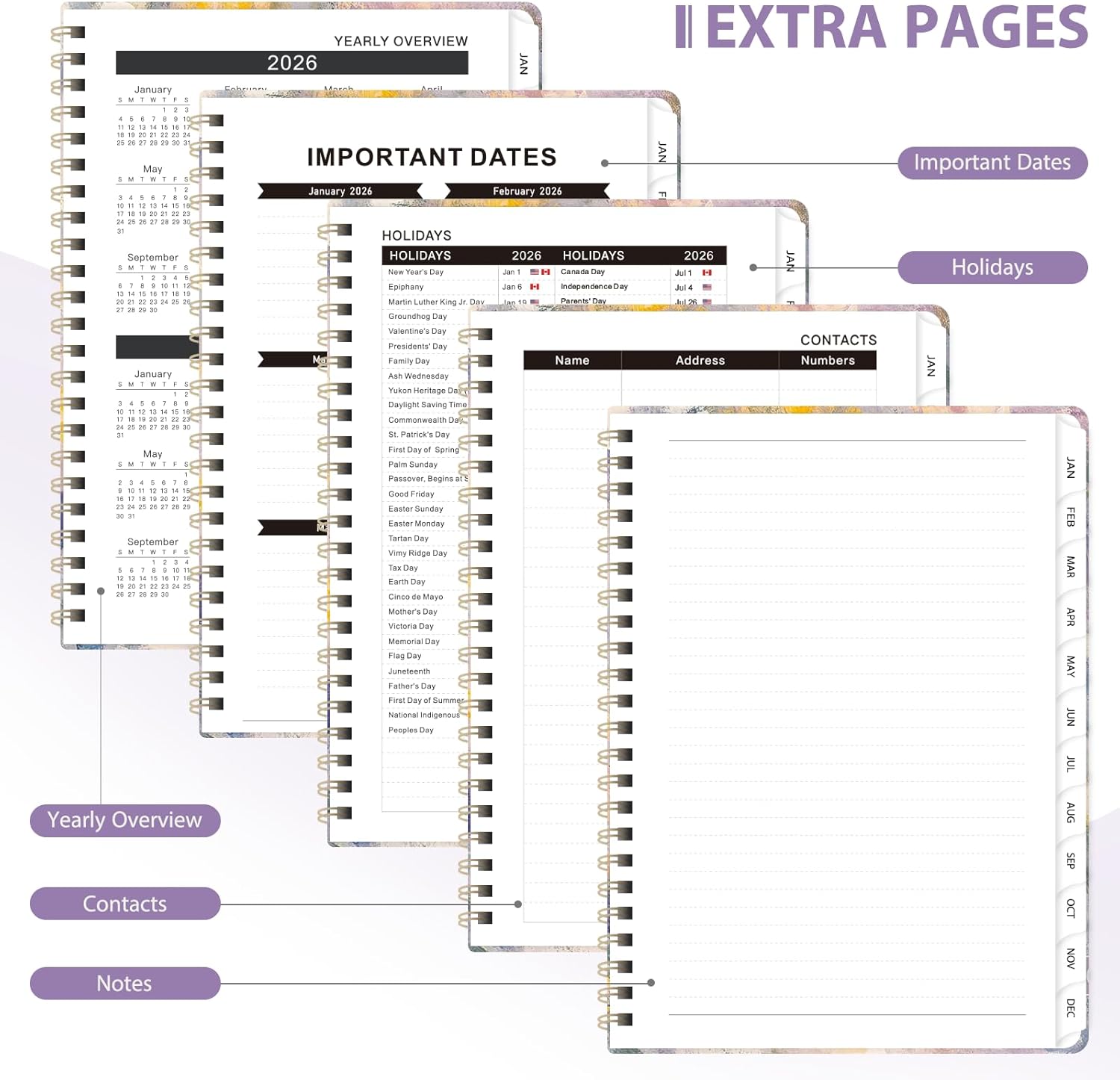 - [MONTHLY PLANNER] - Providing ample writing space, this 2026 calendar planner includes monthly calendar layouts, two-month reference calendars, a contact page, an important date page, and a holiday list.