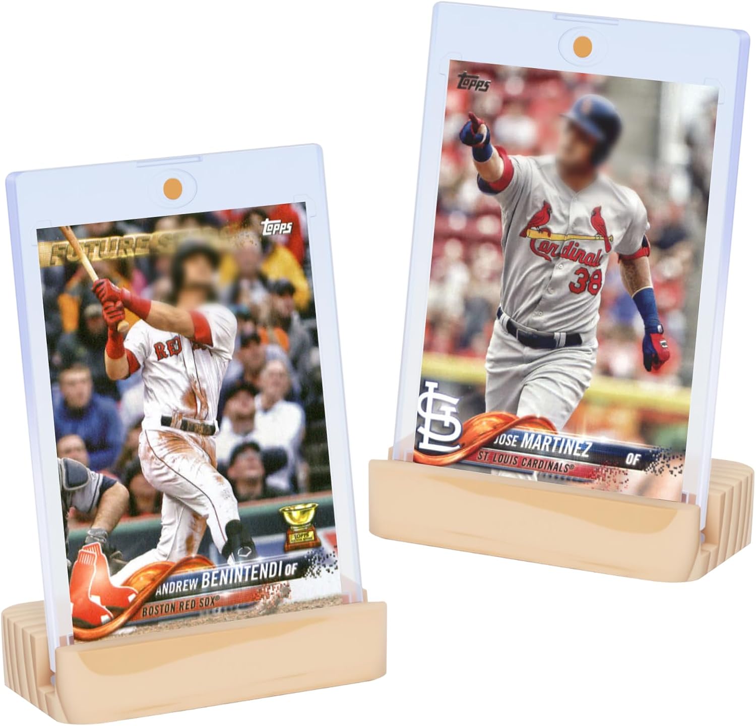 - Card Holder & Wooden Stand Combo: This package includes 2 magnetic card holders and 2 wooden card stands. Providing secure storage while letting you showcase your cards on any desk. Note: Trading cards not included