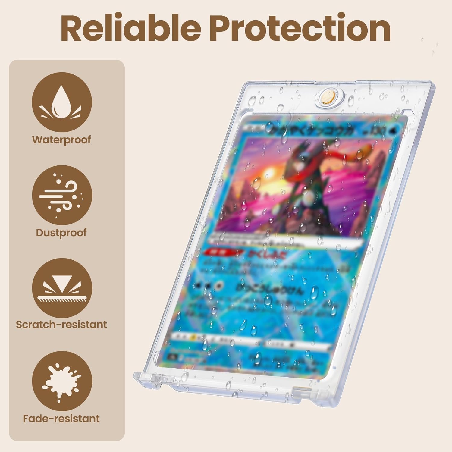 - Built to Last: Made with acrylic, this magnetic card display stands offer water and dust resistance to protect your cards from scratches, wear, and moisture. Rounded corners prevent damage and ensure lasting protection