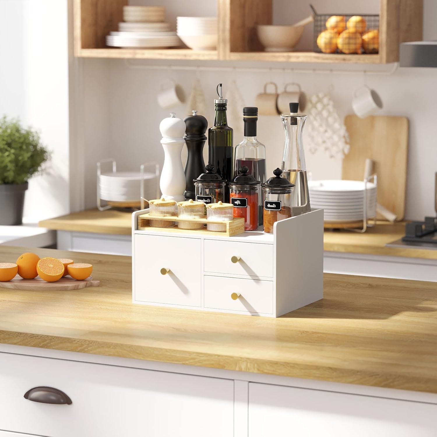 Bamboo Desk Organizer with Drawers Wooden Desktop Storage Organization Box for Bills Office Supplies Kitchen Utensils Organizing Tool for Home Classroom Vanity, No Assembly Required (3 Drawer, White)