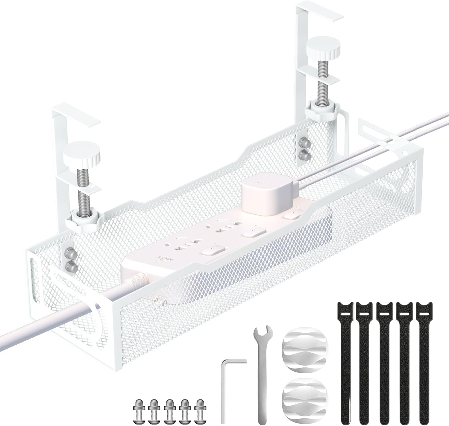 Under Desk Cable Management Tray, No Drill Mesh Desk Cable Tray, Wire Management Tray Cable Management Rack, Wire Organizer and Cable Management Box (White)