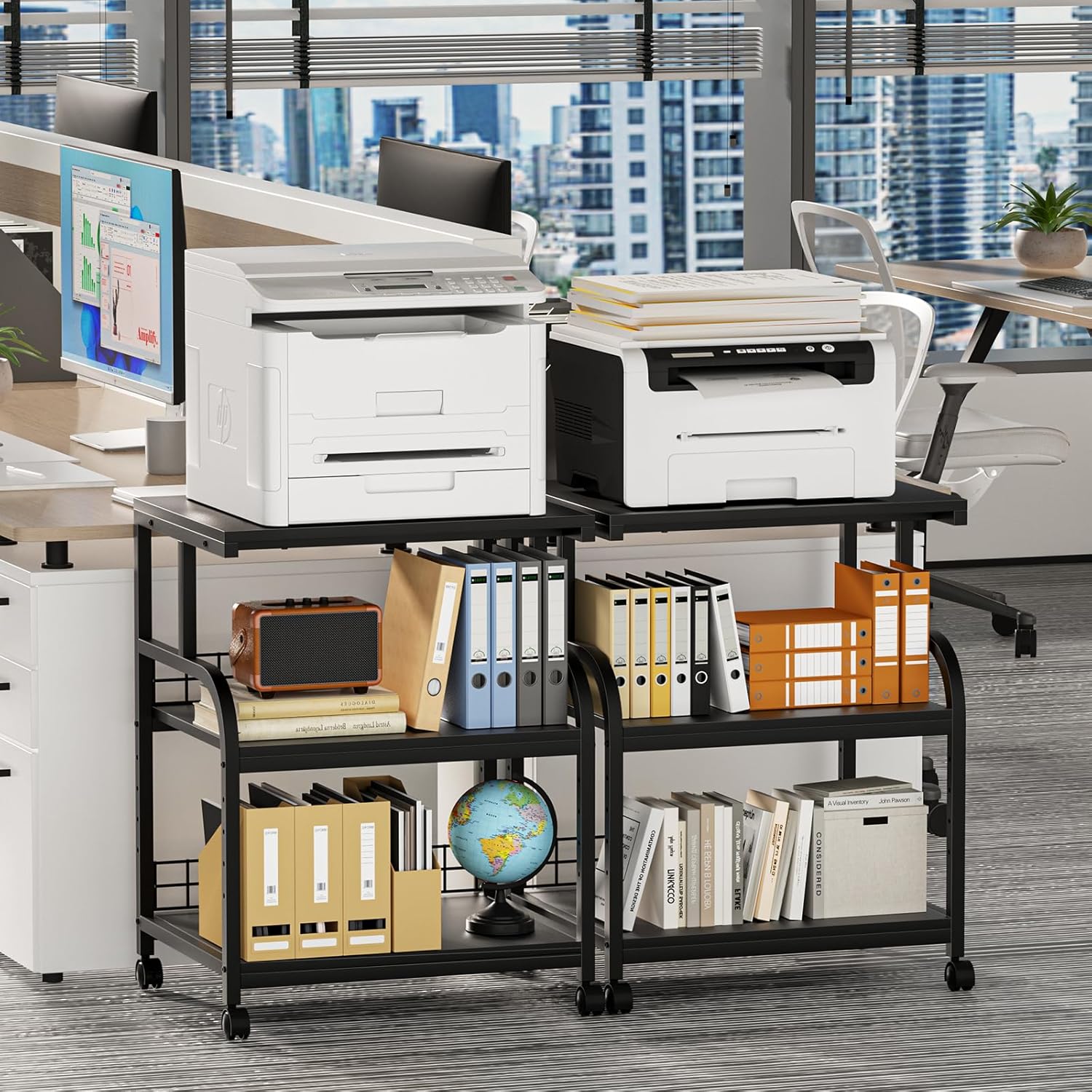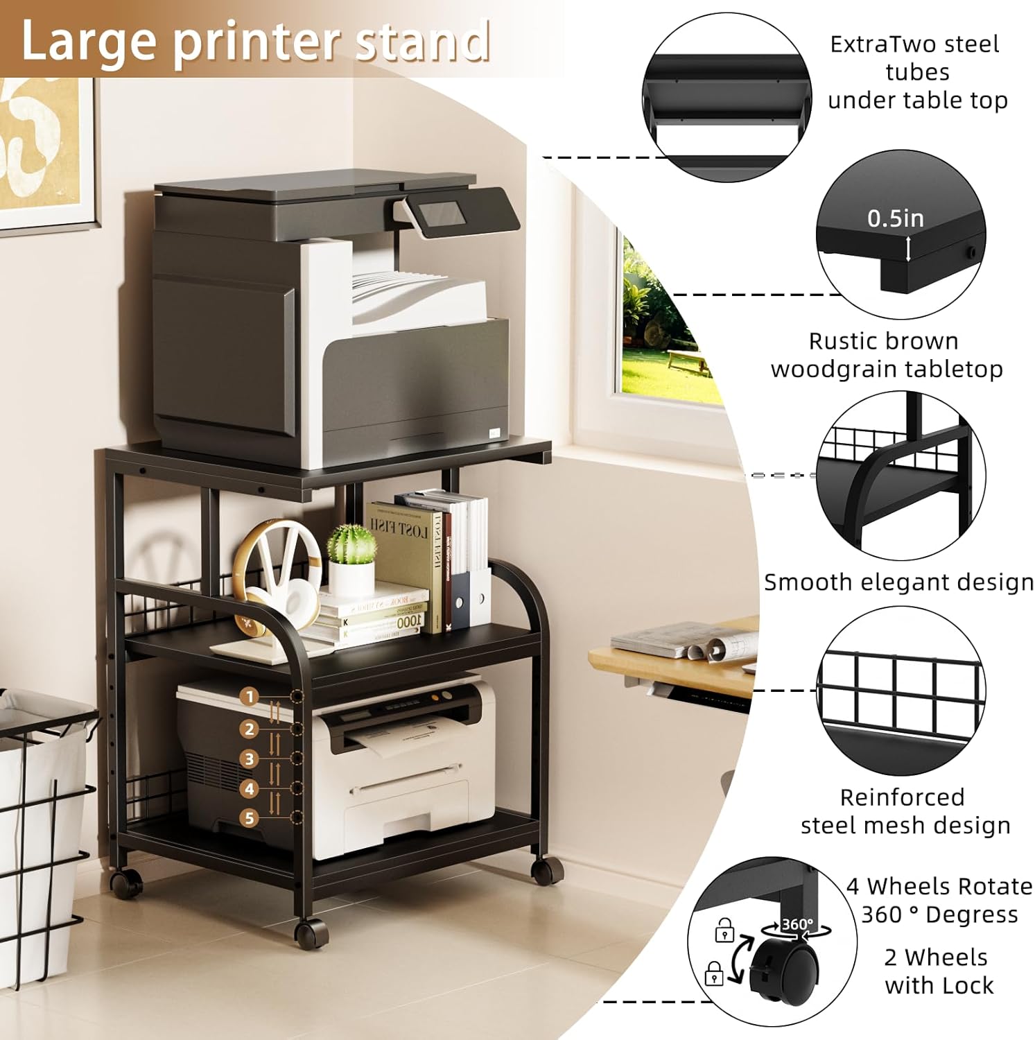 - Includes Casters and Adjusting Feet: The four wheels of the large printer table for home office with storage can rotate 360 degrees, and two of them can be locked to provide greater security for your printer and other office equipments.We also offer four solid adjusting feet that you can replace whenever you need them.