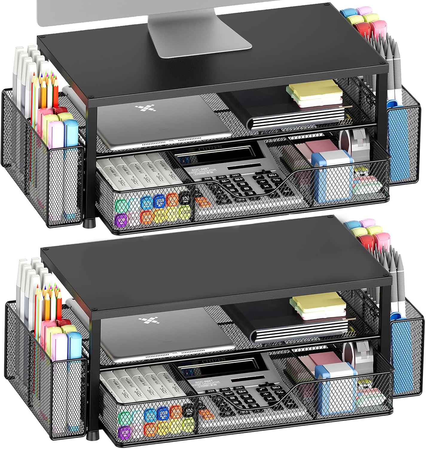 - ăSave SpaceăïŒThis 2-Tier monitor stand with drawer and 2 hanging pen holders provides ample storage space to keep your office supplies and office desk accessories neatly organized and easily accessible, keeping your workspace tidy and improving your sense of well-being