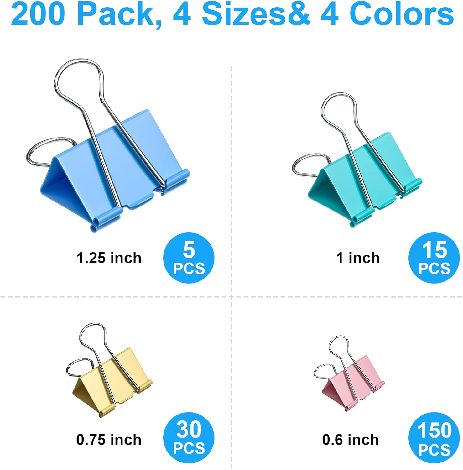 - 200 Pcs Colored Binder Clips Assorted Sizes: Includes 5 (1.25"), 15 (1"), 30 (0.75"), and 150 (0.6") metal paper clamps. Plenty of colored clips office supplies to meet all your daily needs