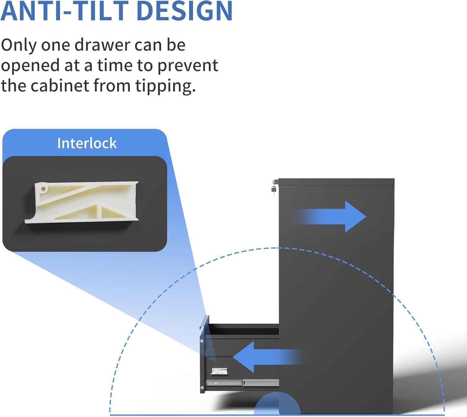 - ăAnti-tilt DesignăThis vertical legal file cabinet designed with full extension and steel ball-bearing suspension, all drawers of the file cabinets can be opened and closed quietly and easily. The anti-tilt system ensures that only one drawer can be open at a time, preventing the metal file cabinet from tipping over. You can have peace of mind knowing that your important documents and items are safe and secure.
