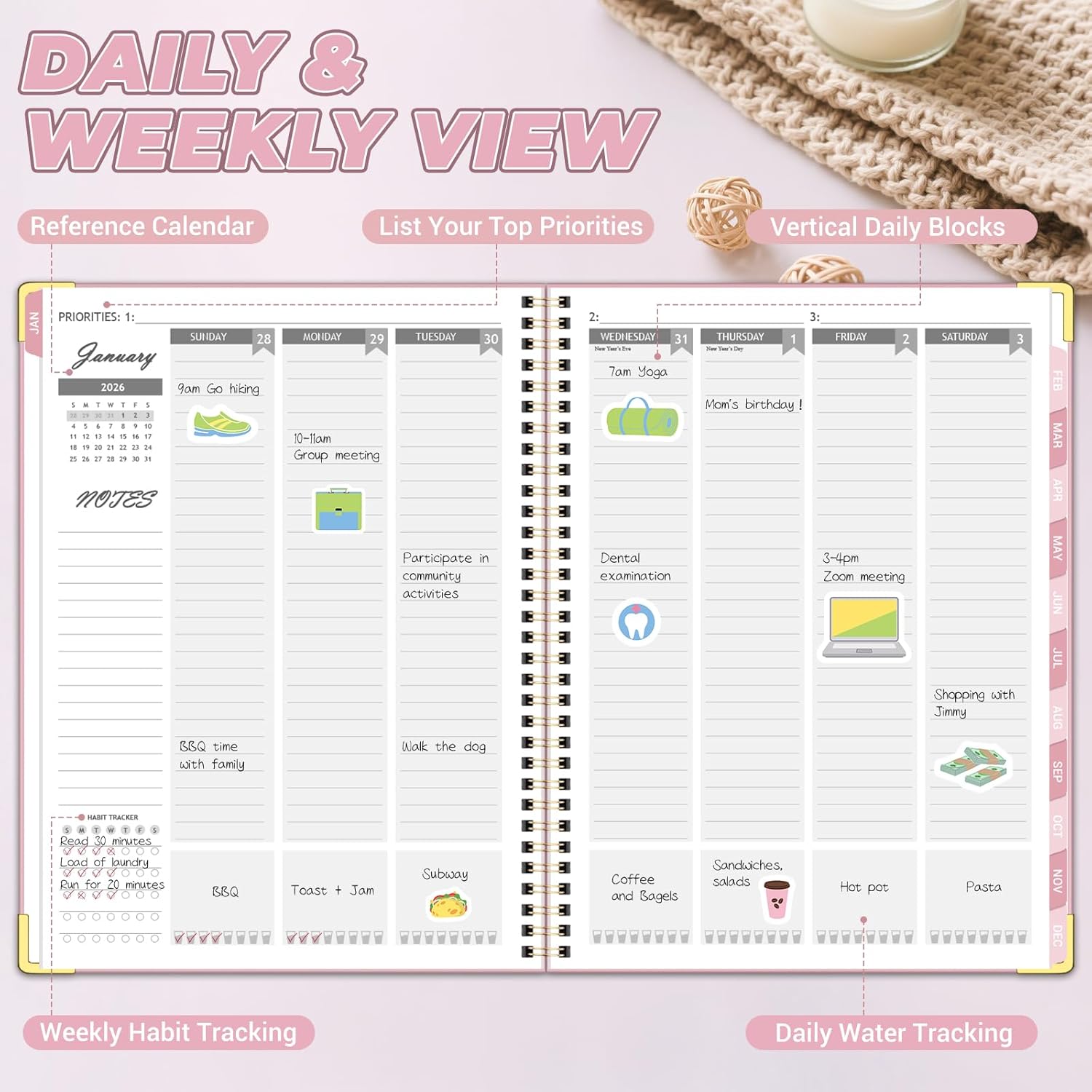 - DAILY & WEEKLY PAGES: This calendar planner vertical column view, you can intuitively see the time allocation of the day and improve time control. Academic planner 2026 including a habit tracker, water intake tracker, and dedicated notes space.