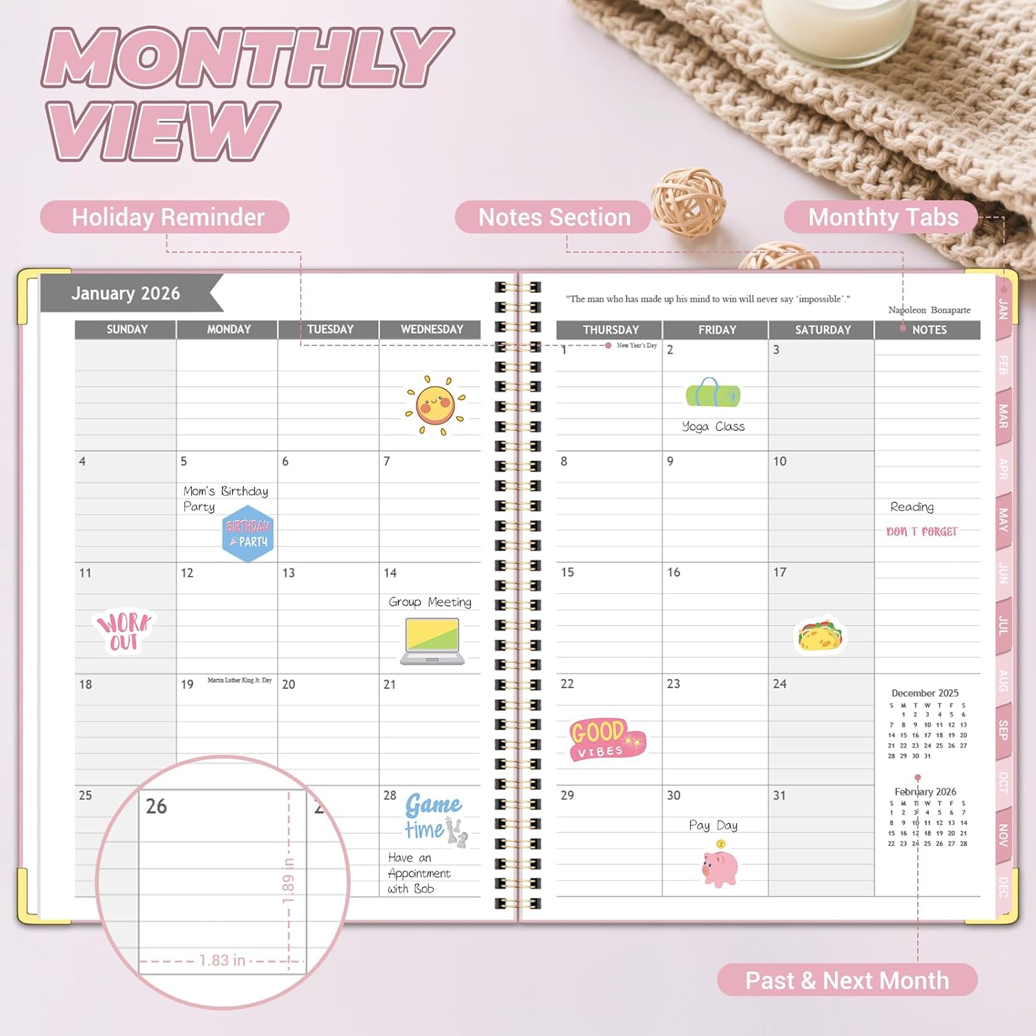 - MONTHLY PAGES: 2026 weekly planner displays US/Canadian holidays and monthly motivational quotes. Agenda planner includes past/previous calendar references so you can better review the past and plan for the future.