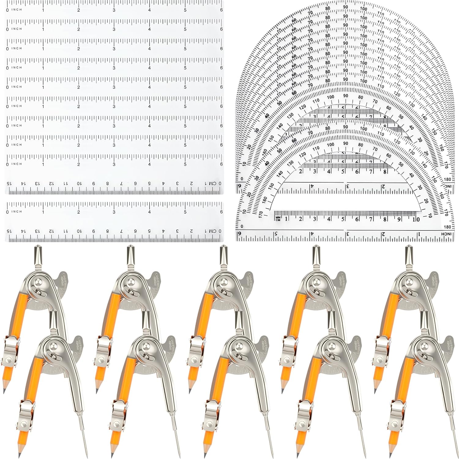 - Comprehensive Math Tool Set: this math compass combination set includes 10 pieces metal math compasses, 10 pieces pencils (which have been installed on a compass for your direct use), 10 pieces geometric protractors and 10 pieces rulers, providing ample quantities for everyday use or sharing with family and friends