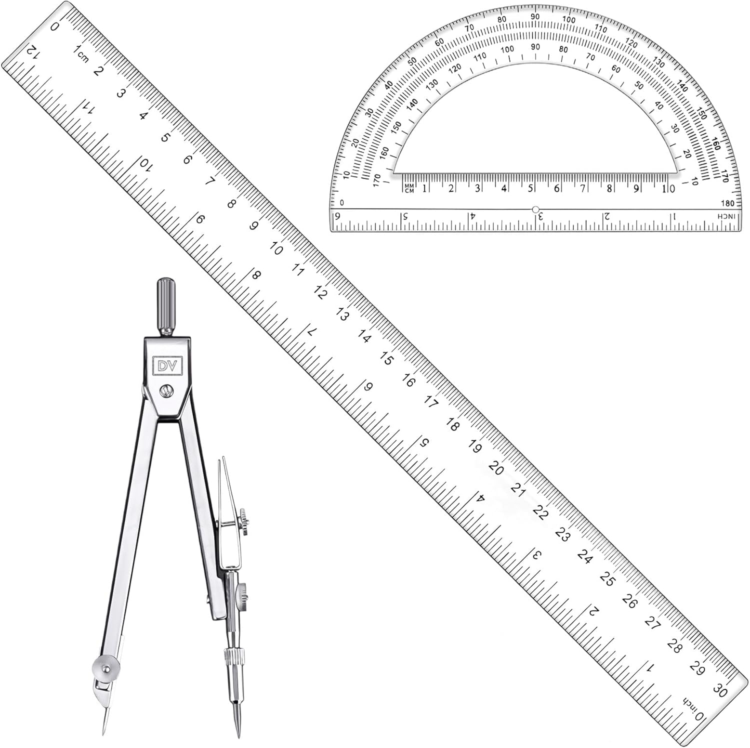 - Versatile 3-Piece Measurement Set: This set includes a standard 12 inch ruler, a 180-degree protractor, and a compass for geometry tasks, covering essential measuring and drawing needs for various applications.