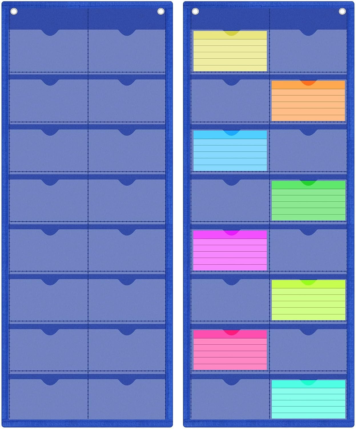 2 Pack 3'' x 5'' Index Card Holder Sleeve 16 Slot Plastic Organizer Hanging Wall Mount Business Note Cardholder PVC Clear Organizer Pocket for Classroom Office Library Home (Blue)