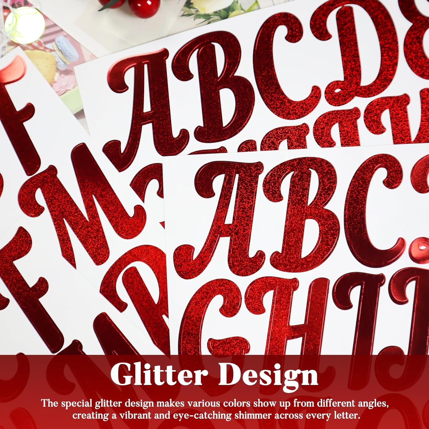 - Red Letters: This set includes 10 sheets of red glitter alphabet and symbol stickers, with each sheet containing one set of alphabets.