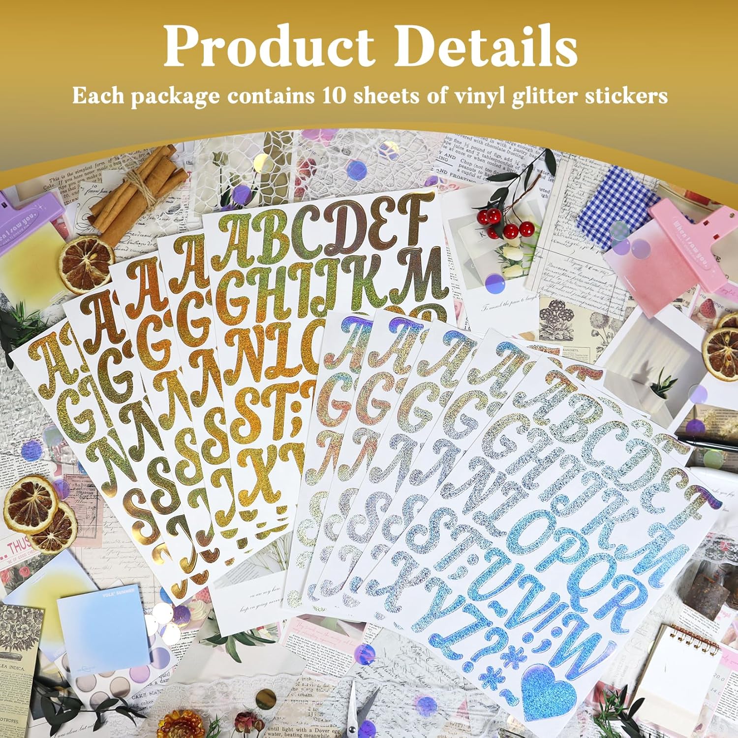 - Gold and Silver Letters: This set includes 10 sheets of glitter alphabet and symbol stickers, comprising 5 gold-colored and 5 silver-colored sheets, with each sheet containing one complete set of alphabets.